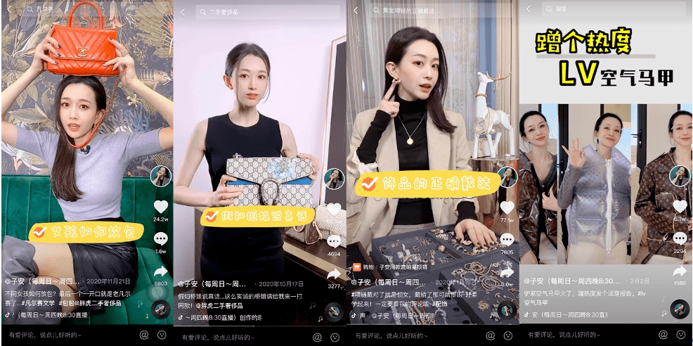 凭借在时尚行业的深厚积累,子安很快在抖音电商直播中崭露头角。2020年,子安受邀加入抖音电商二手奢侈品直播项目,其自身的专业优势和具有亲和力的形象使她迅速成为该赛道的TOP 1。