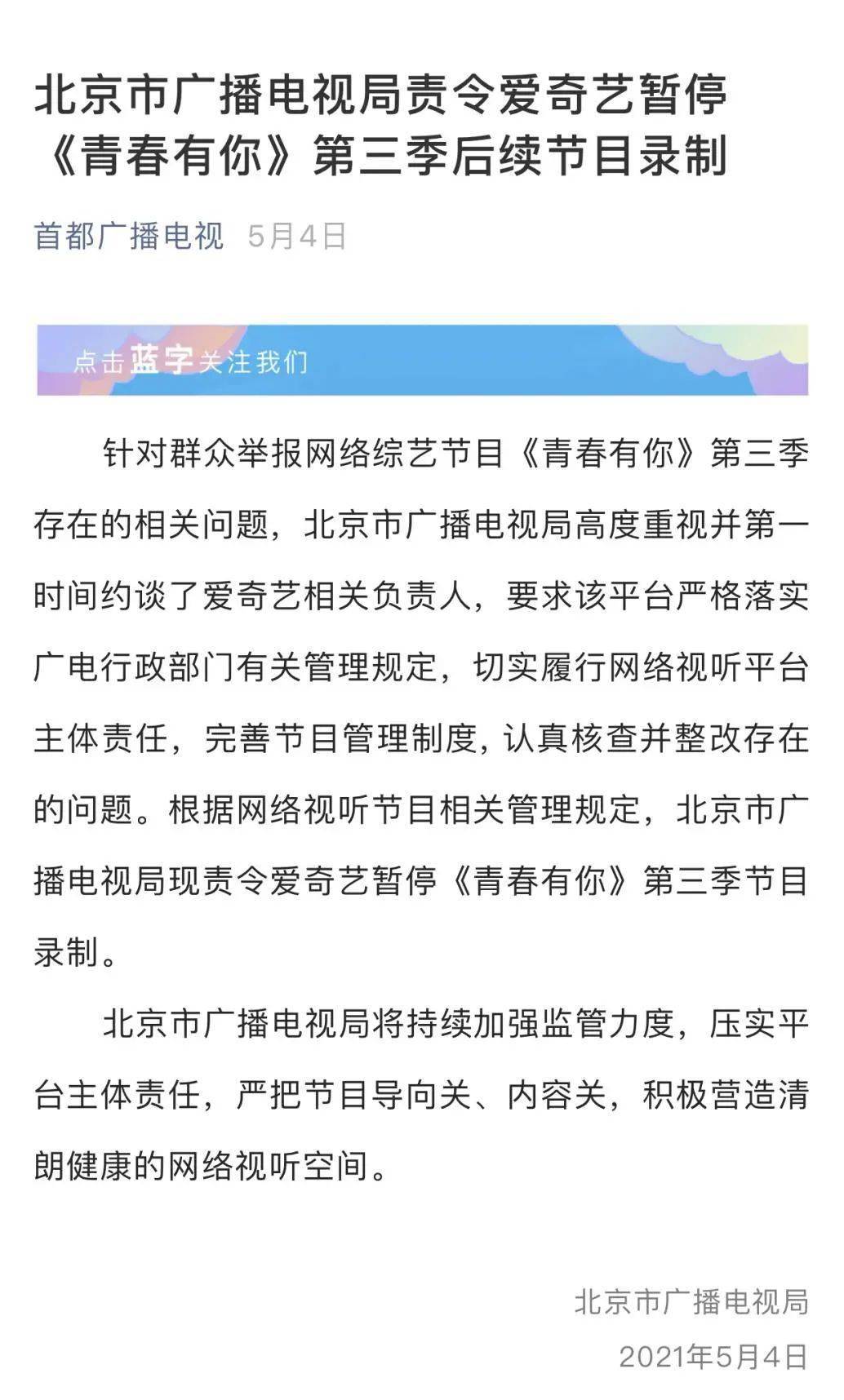 可随着选秀节目的频繁,造星也开始变得难产起来,很多基本出道即巅峰,成团后再无人问津。大众其实也都知道选秀综艺衰败是迟早的事情,可平台还是乐此不疲地继续做着“割韭菜”的事。"倒奶事件"给了爱奇艺乃至整个偶像选秀市场当头一棒。央视点名批评"这种荒诞的追星方式",背后是商家和平台的诱导,商家和平台在倒奶事件中难辞其咎。事情曝光后,北京市广播电视局随即责令爱奇艺暂停《青春有你》第三季节目录制,这也是偶像选秀节目有史以来首个没有决赛的选秀,“饭圈”的不良风气让选秀综艺彻底成为众矢之的。
