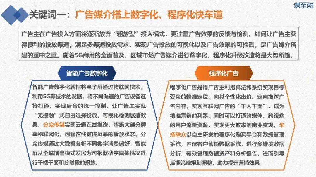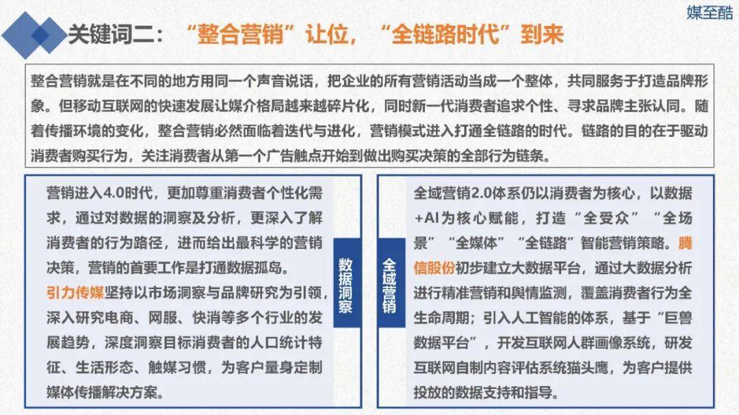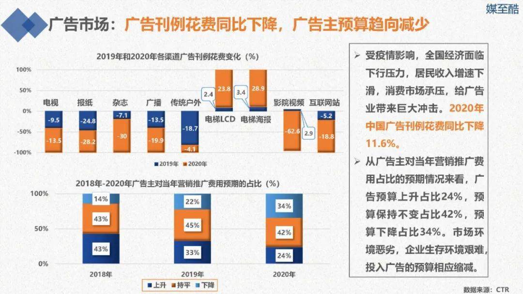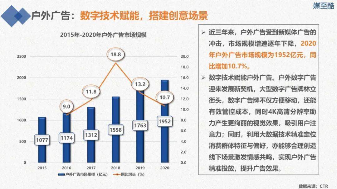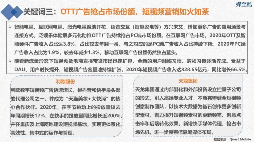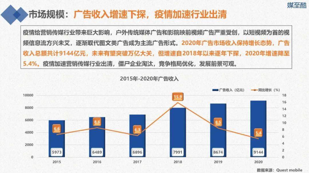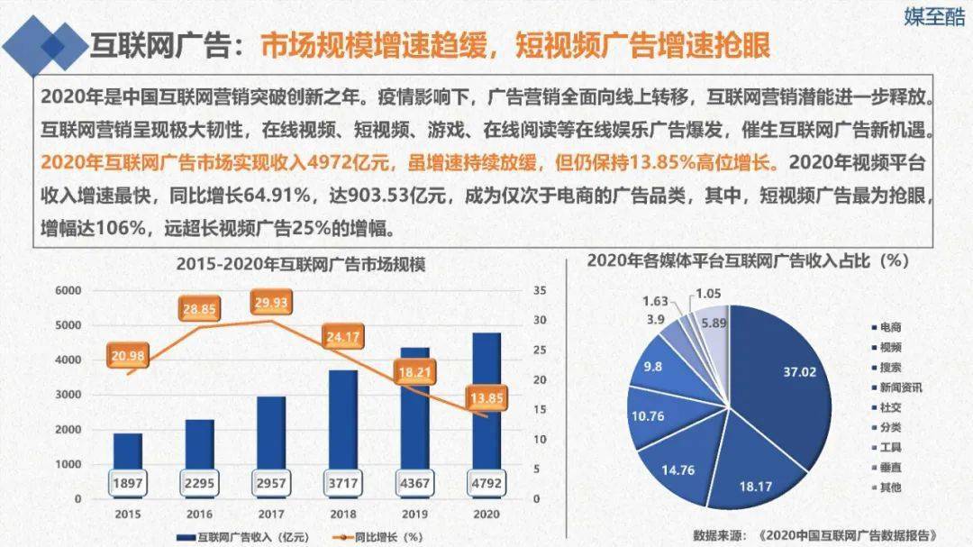 2020年在新冠疫情影响下,广告营销全面向线上转移,营销传媒行业迎来发展新契机,进入转型深水区。线上线下边界渐趋模糊,数字营销席卷广告市场,数字技术赋能户外广告,实现精准投放,提升广告效果。内容营销是大势所趋,视频时代将全面来临。2020年互联网营销进一步释放潜能,在线视频、短视频、游戏等在线娱乐广告如日东升,短视频广告容量池持续扩张,收入增速最为抢眼,视频广告逐渐取代图文广告成为主流广告形式。整合营销已逝,全链路时代到来,侧重于实现用户沉淀与全生命周期运营,完成从营销到经营、从效果到品牌、从短期到长效的营销闭环。
