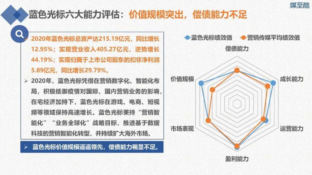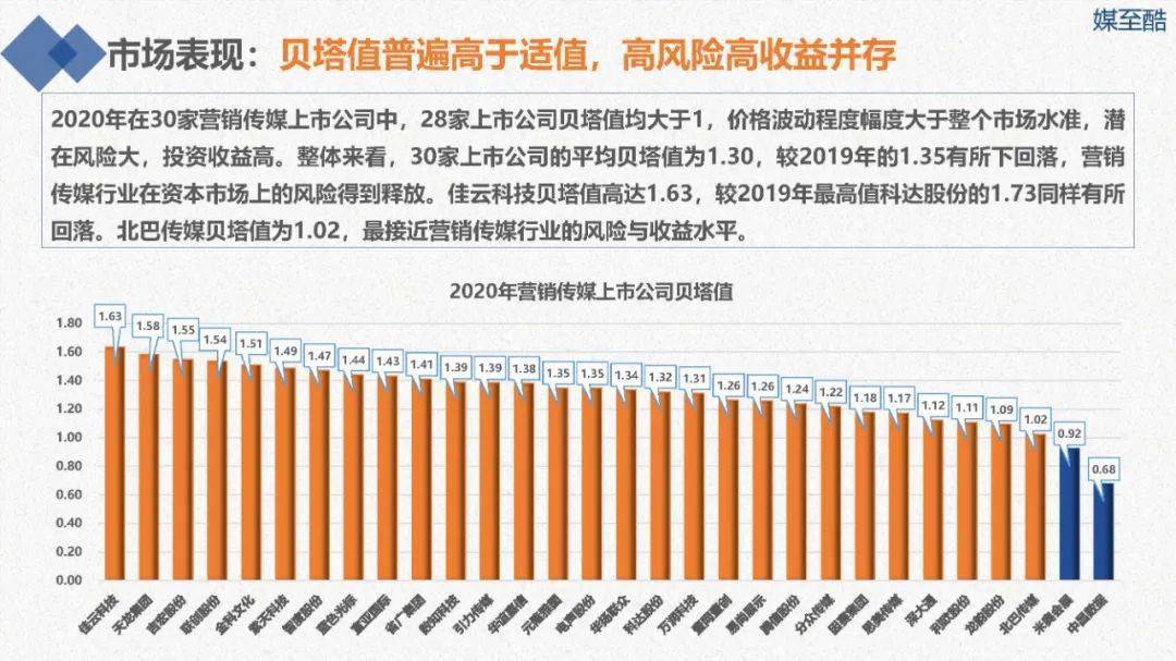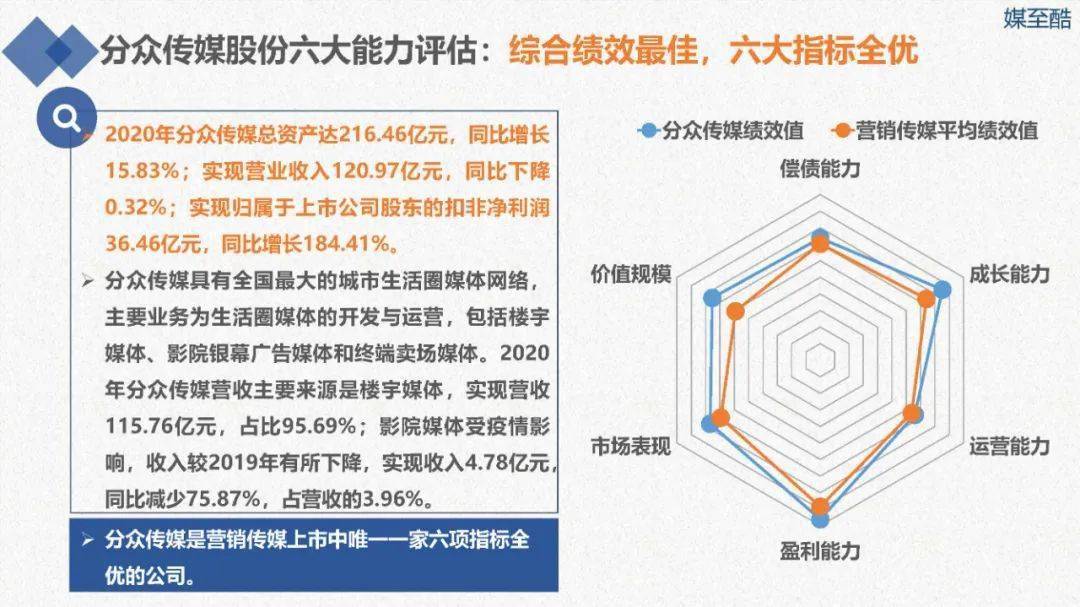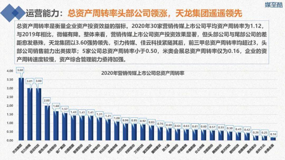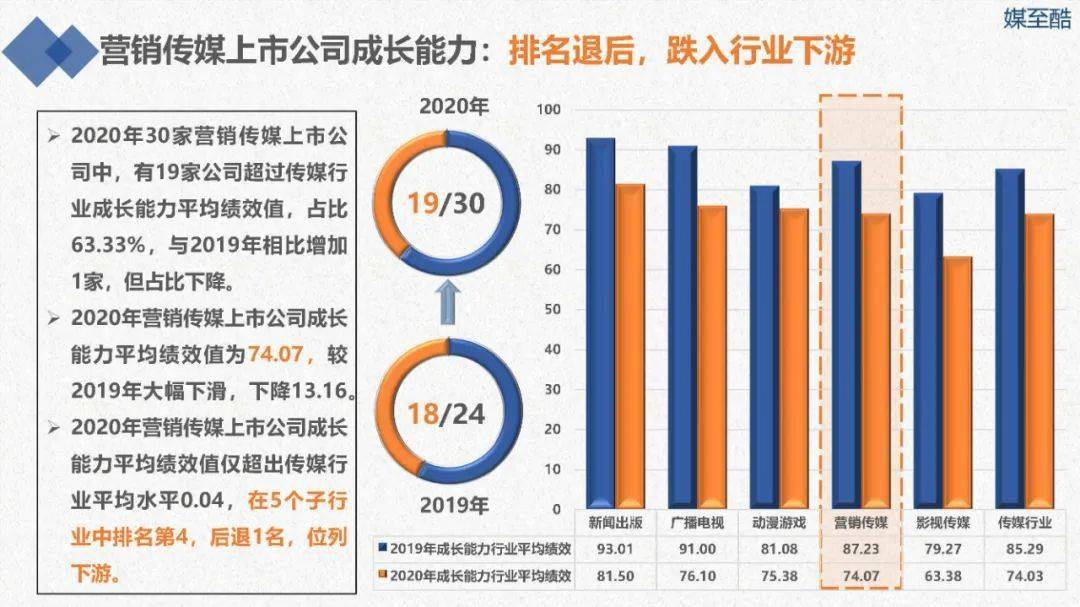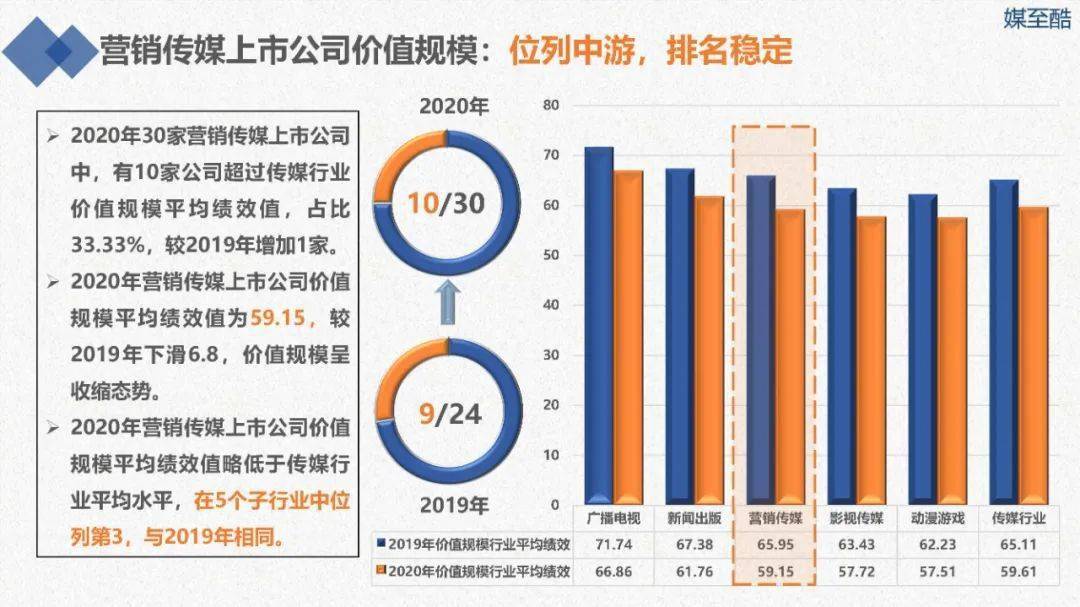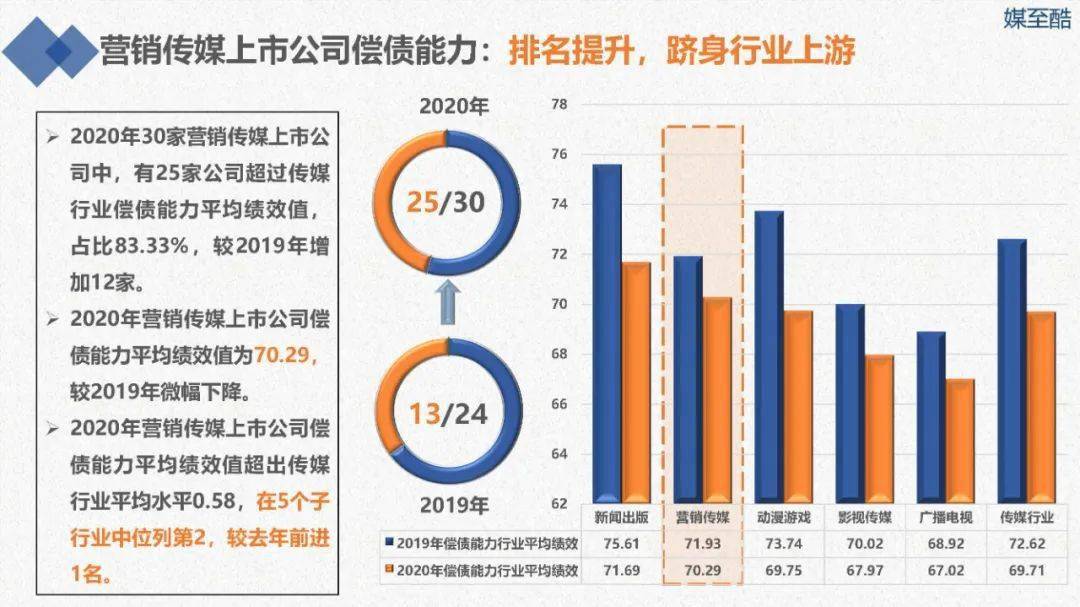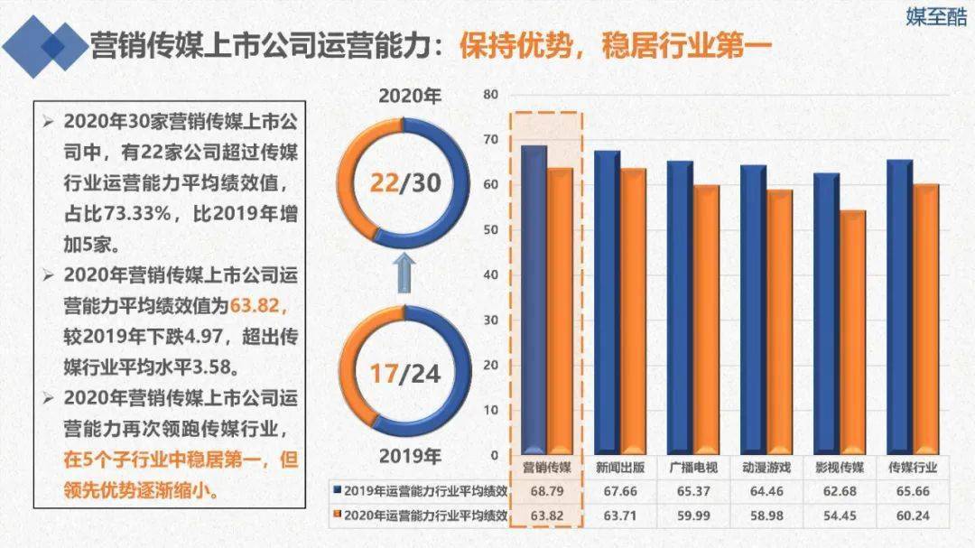 营销传媒上市公司综合绩效平均值略高于传媒行业平均水平,三项细分指标超过传媒平均值,分别是运营能力、成长能力和偿债能力。在传媒行业五大细分行业指标排名中,营销传媒运营能力独占鳌头;偿债能力名列前茅;价值规模稳居第三;盈利能力和成长能力退至下游;市场表现不容乐观,行业垫底。