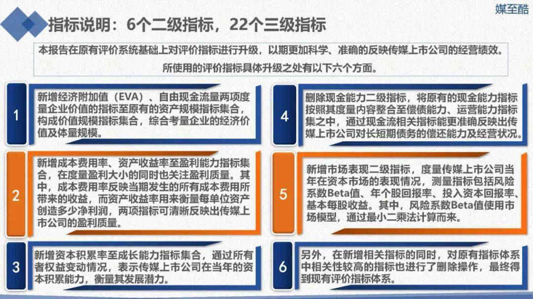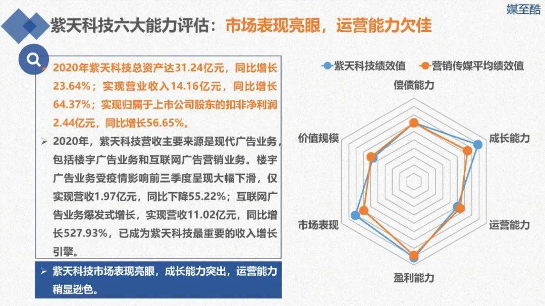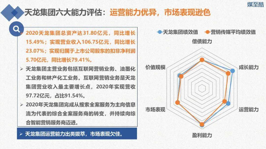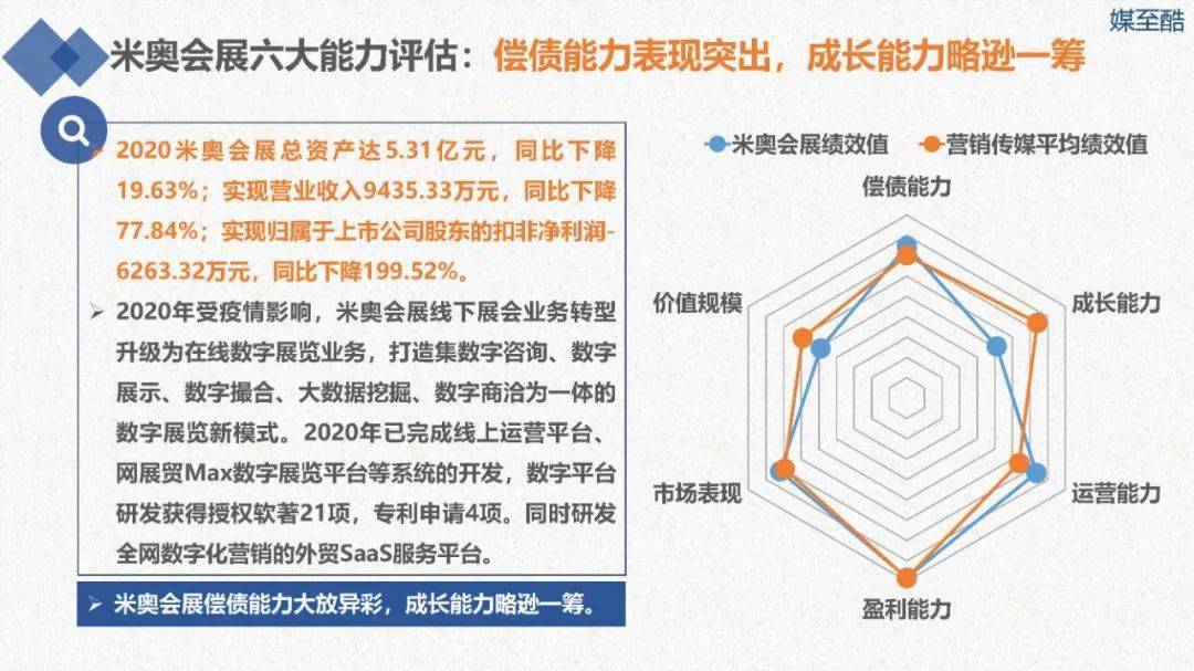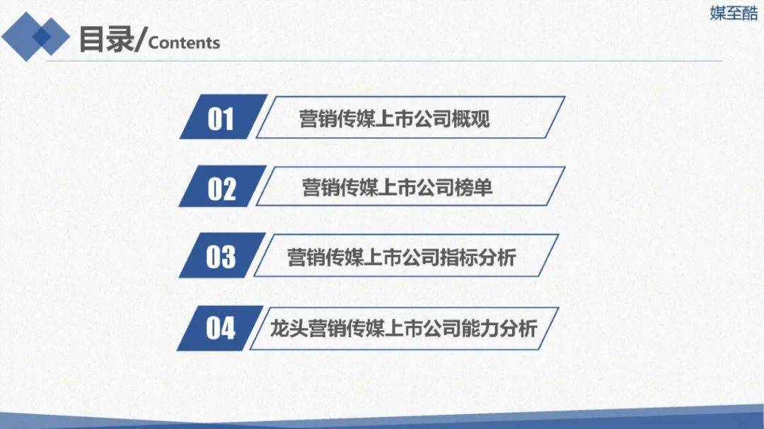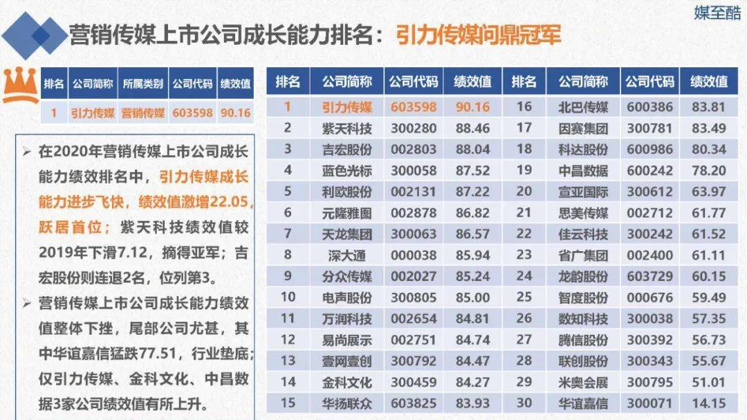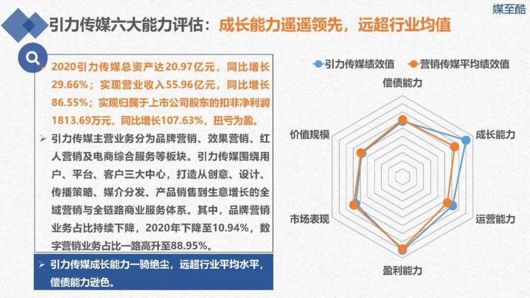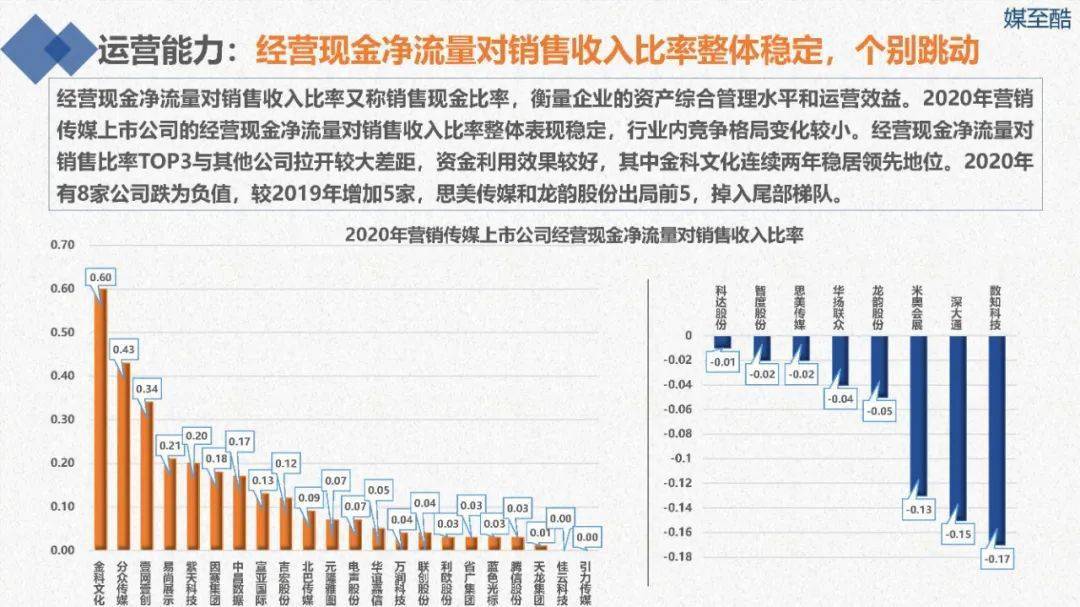 营销传媒上市公司综合绩效平均值略高于传媒行业平均水平,三项细分指标超过传媒平均值,分别是运营能力、成长能力和偿债能力。在传媒行业五大细分行业指标排名中,营销传媒运营能力独占鳌头;偿债能力名列前茅;价值规模稳居第三;盈利能力和成长能力退至下游;市场表现不容乐观,行业垫底。