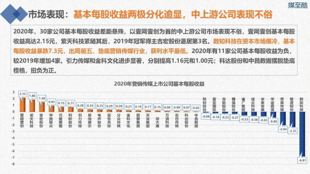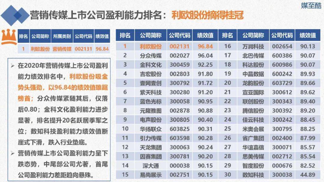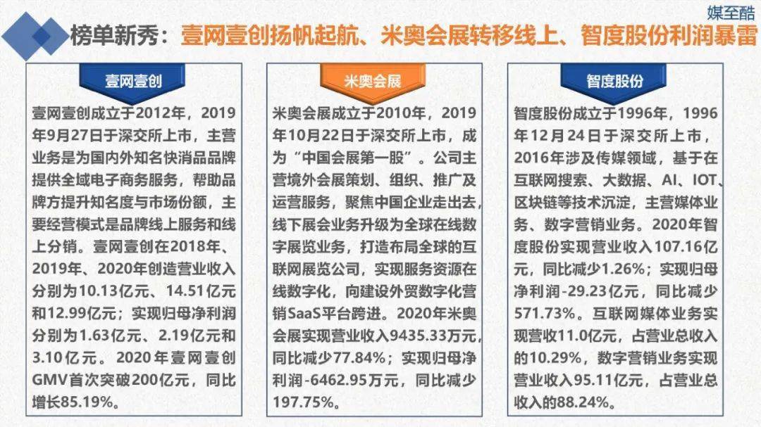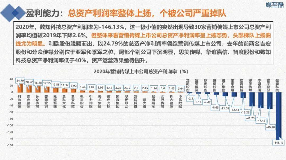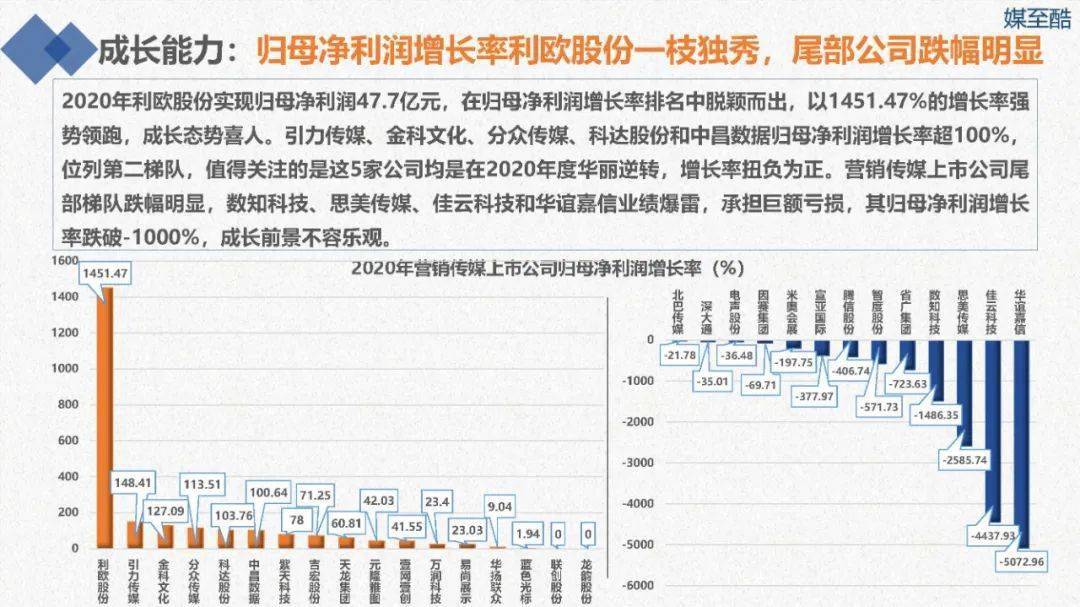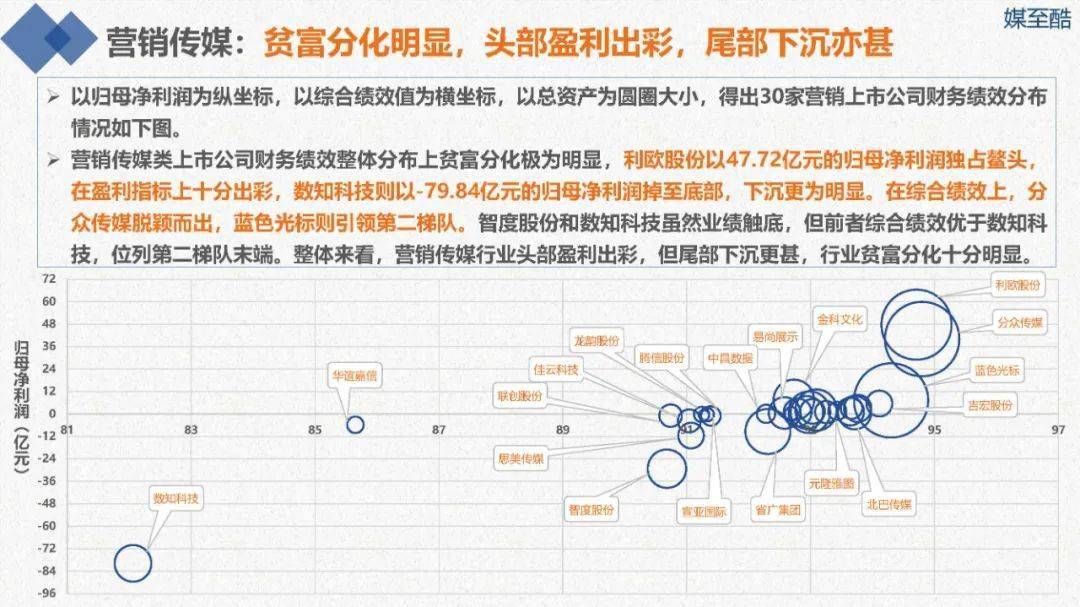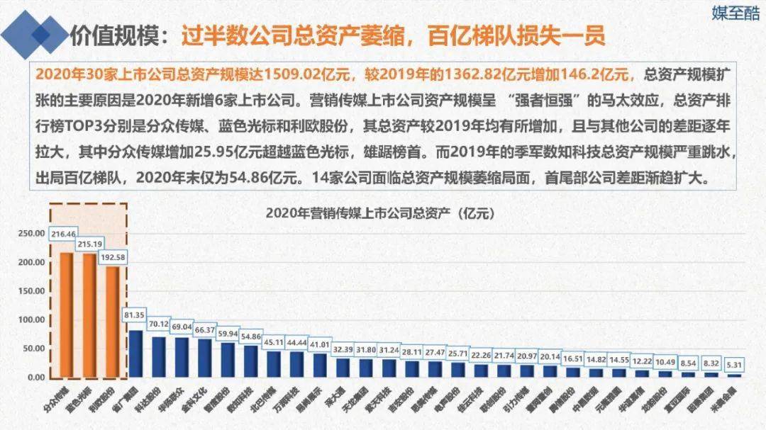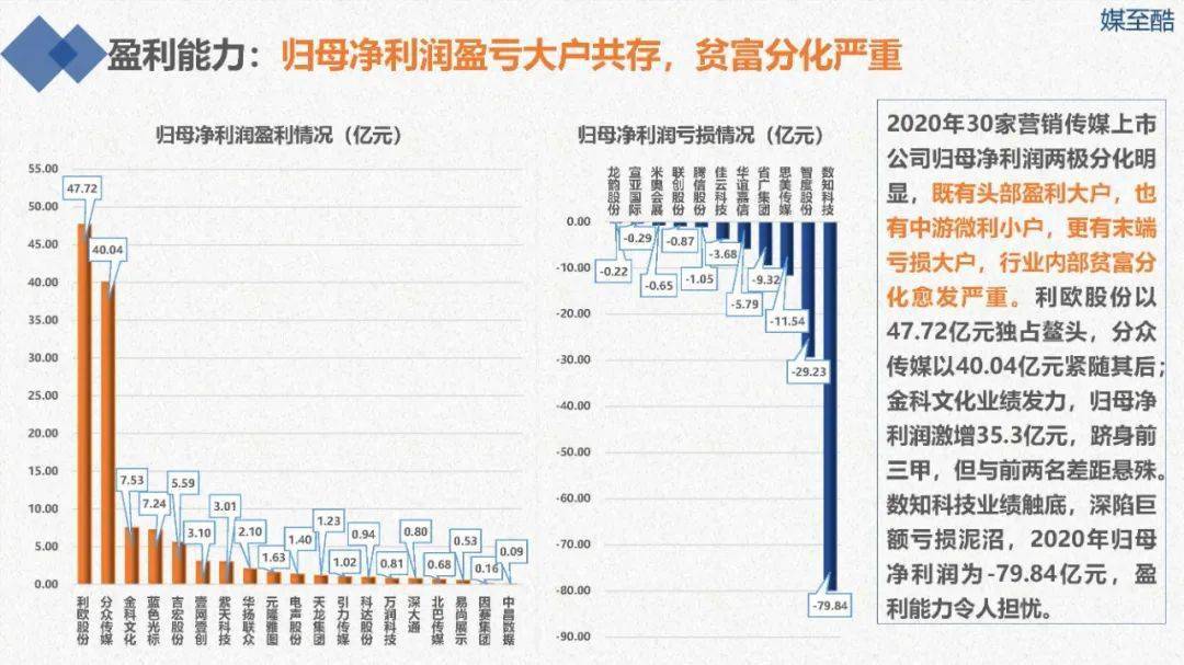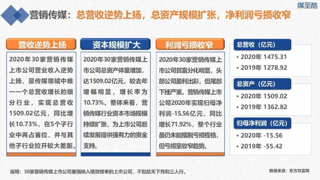 2020年营销传媒上市公司总营收逆势上扬,达1475.31亿元,在五个传媒子行业中再居首位;新上市公司涌现,助推总资产规模呈持续扩张之势。营销传媒上市公司净利润-15.56亿元,亏损幅度收窄,但业绩分化悬殊、盈亏大户并存;头部盈利出彩,利欧股份业绩发力,以47.74亿元净利润雄踞榜首;尾部下沉尤甚,数知科技业绩触底,以-79.84亿元深陷亏损泥潭,垫底传媒上市公司。