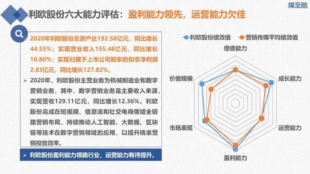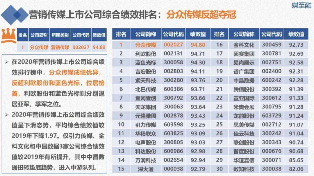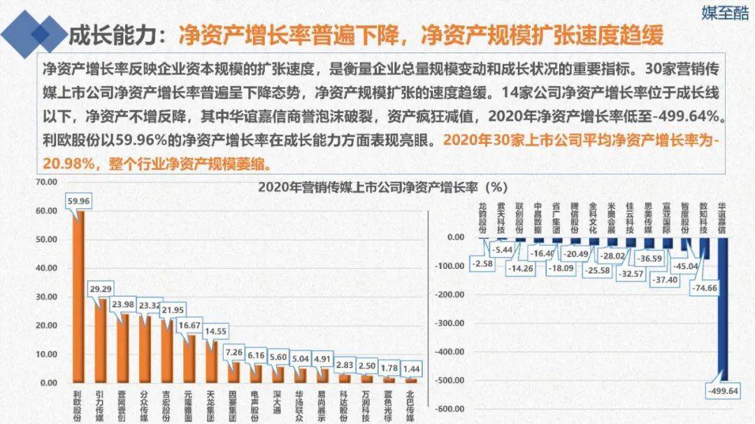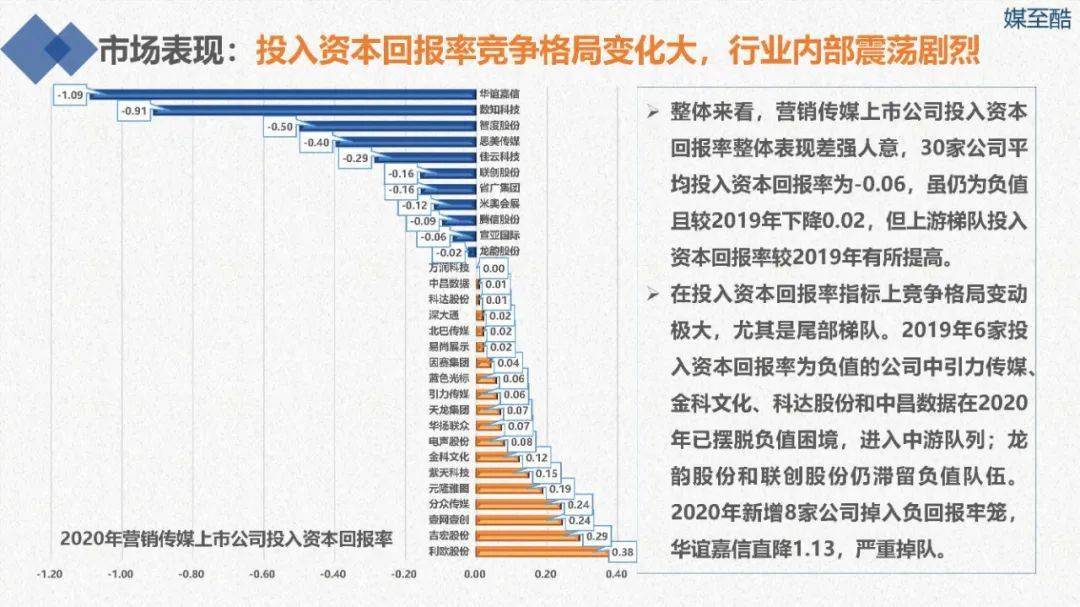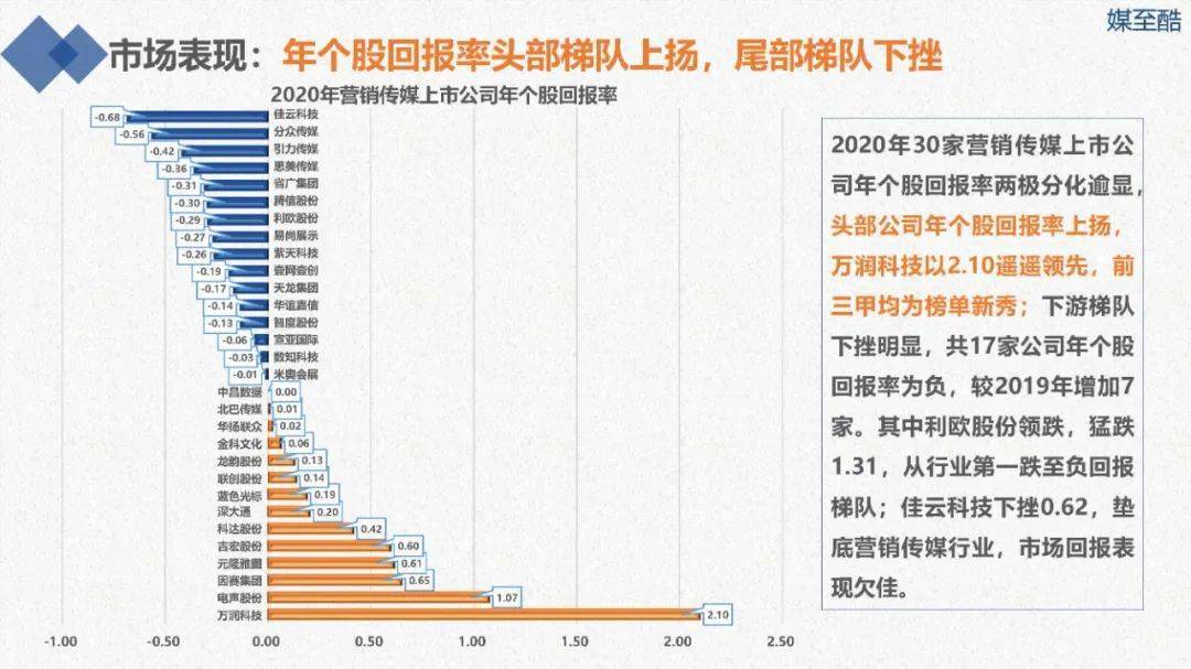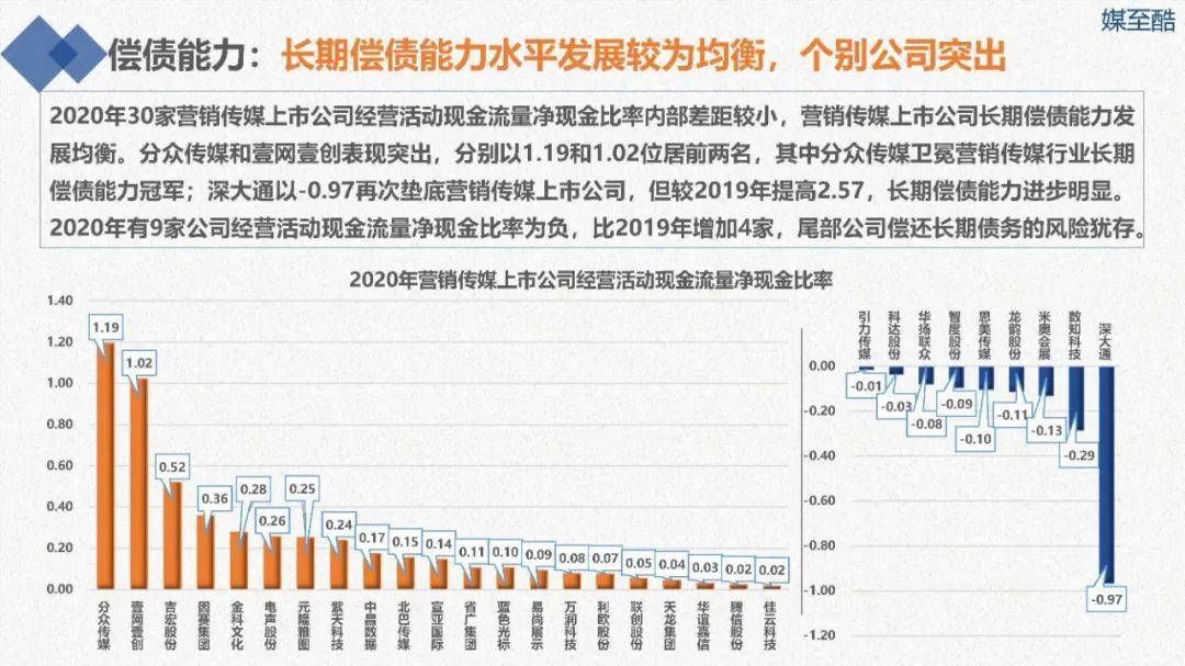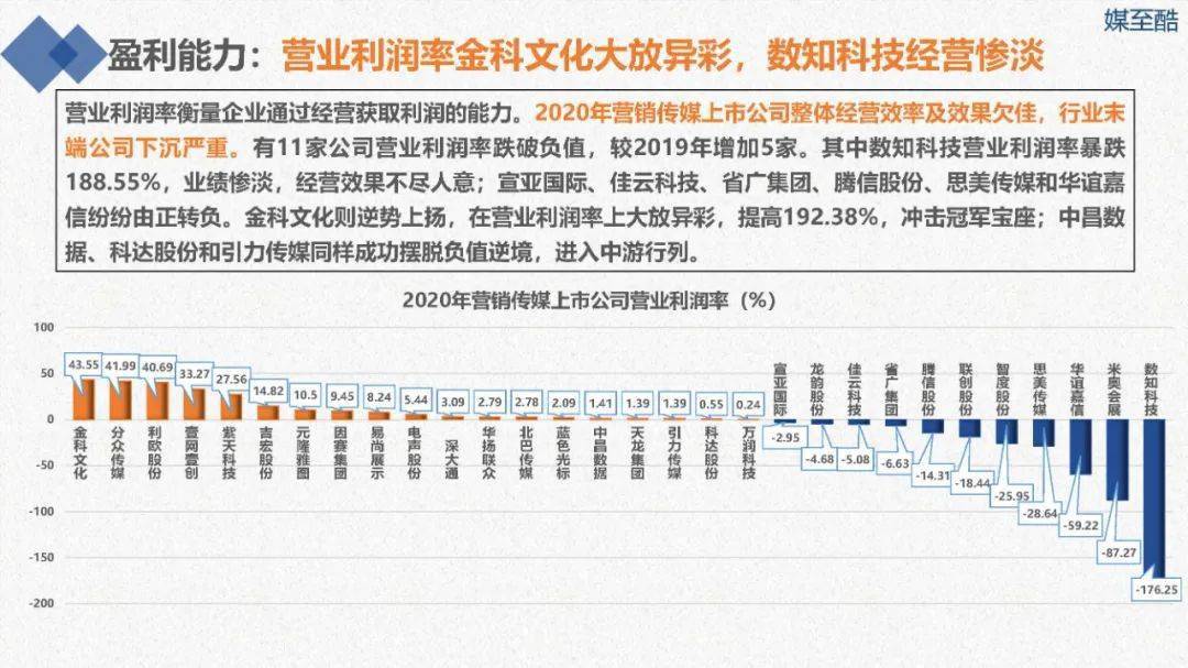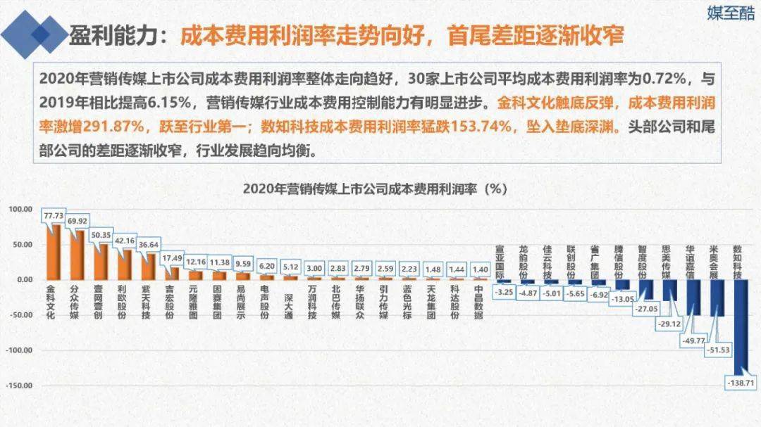 2020年营销传媒上市公司总营收逆势上扬,达1475.31亿元,在五个传媒子行业中再居首位;新上市公司涌现,助推总资产规模呈持续扩张之势。营销传媒上市公司净利润-15.56亿元,亏损幅度收窄,但业绩分化悬殊、盈亏大户并存;头部盈利出彩,利欧股份业绩发力,以47.74亿元净利润雄踞榜首;尾部下沉尤甚,数知科技业绩触底,以-79.84亿元深陷亏损泥潭,垫底传媒上市公司。