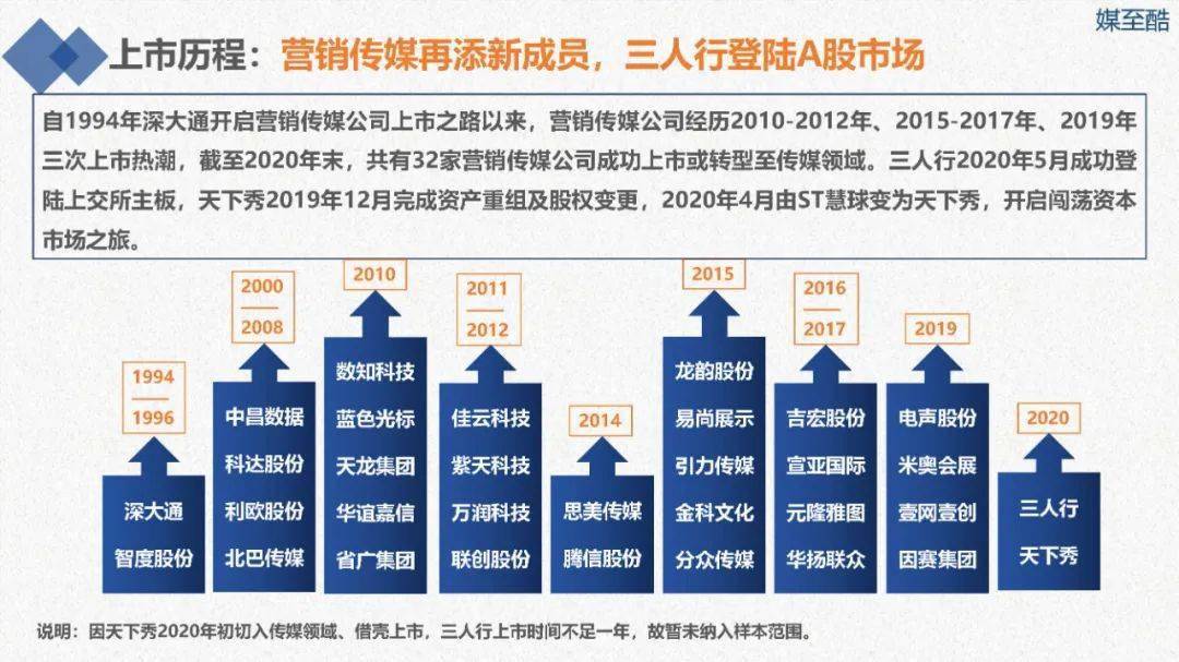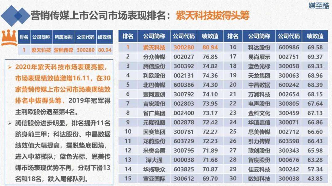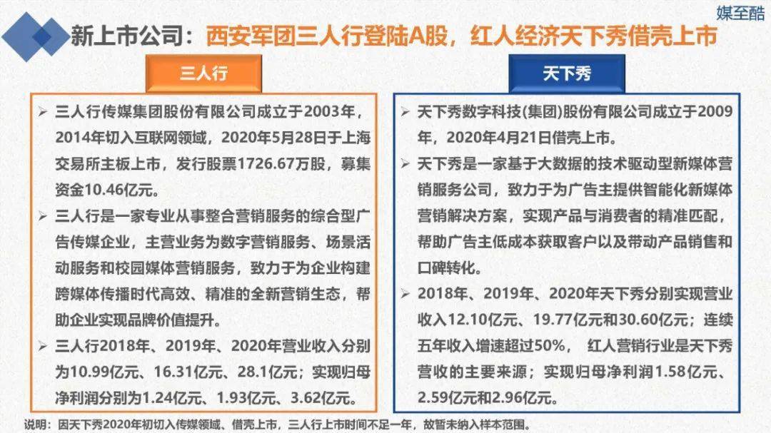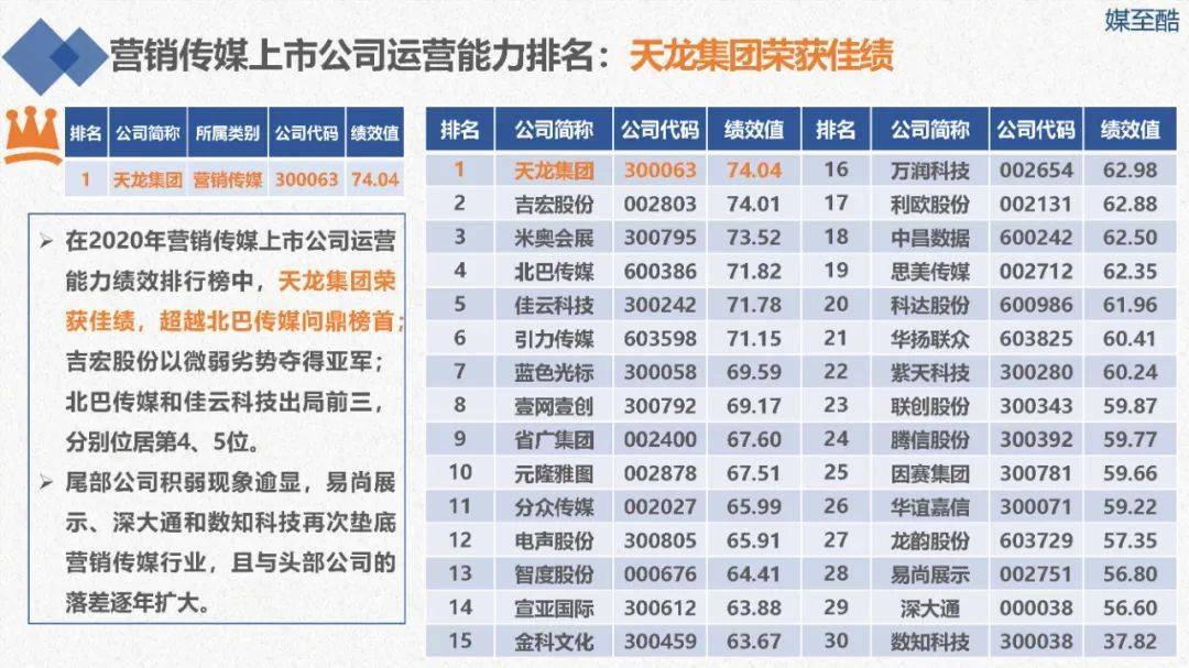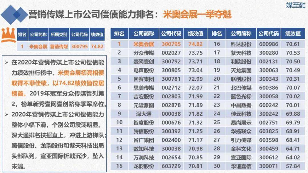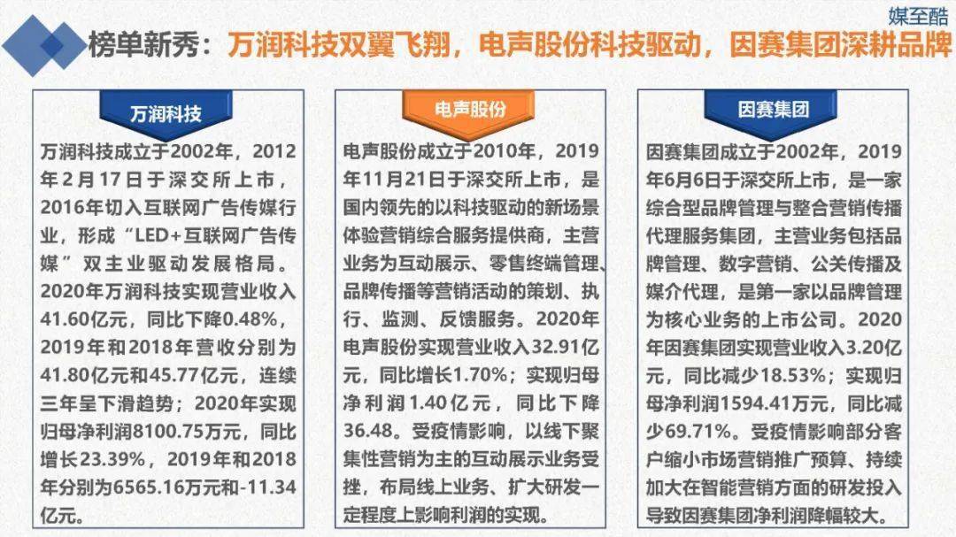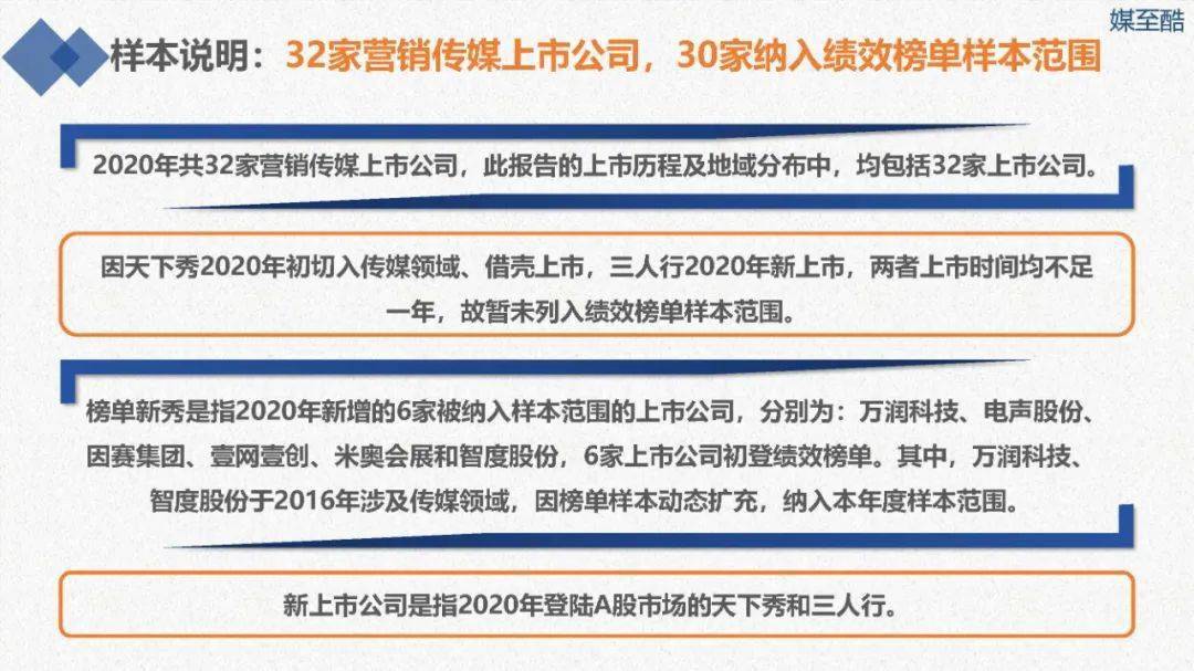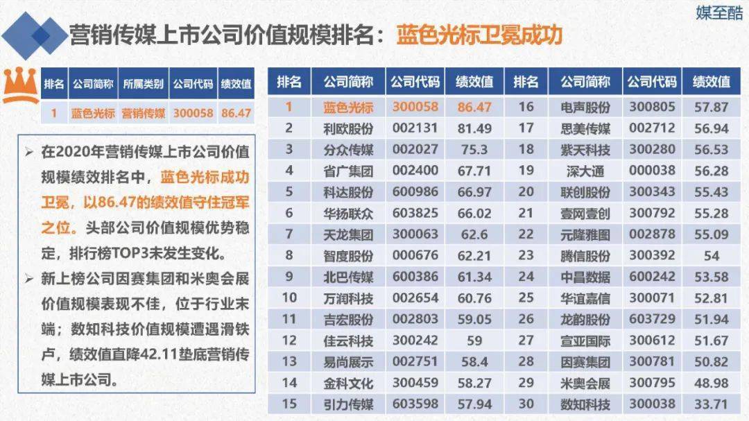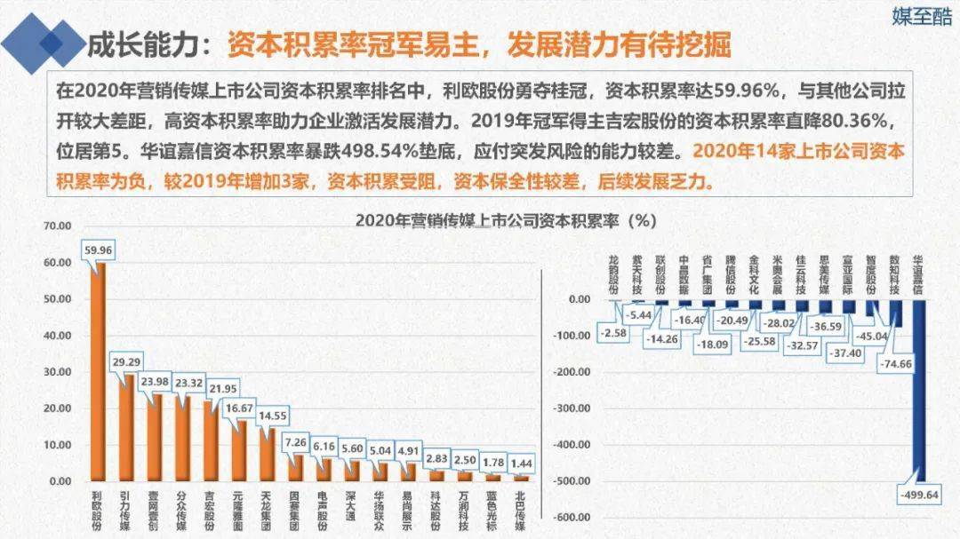 2020年营销传媒上市公司总营收逆势上扬,达1475.31亿元,在五个传媒子行业中再居首位;新上市公司涌现,助推总资产规模呈持续扩张之势。营销传媒上市公司净利润-15.56亿元,亏损幅度收窄,但业绩分化悬殊、盈亏大户并存;头部盈利出彩,利欧股份业绩发力,以47.74亿元净利润雄踞榜首;尾部下沉尤甚,数知科技业绩触底,以-79.84亿元深陷亏损泥潭,垫底传媒上市公司。