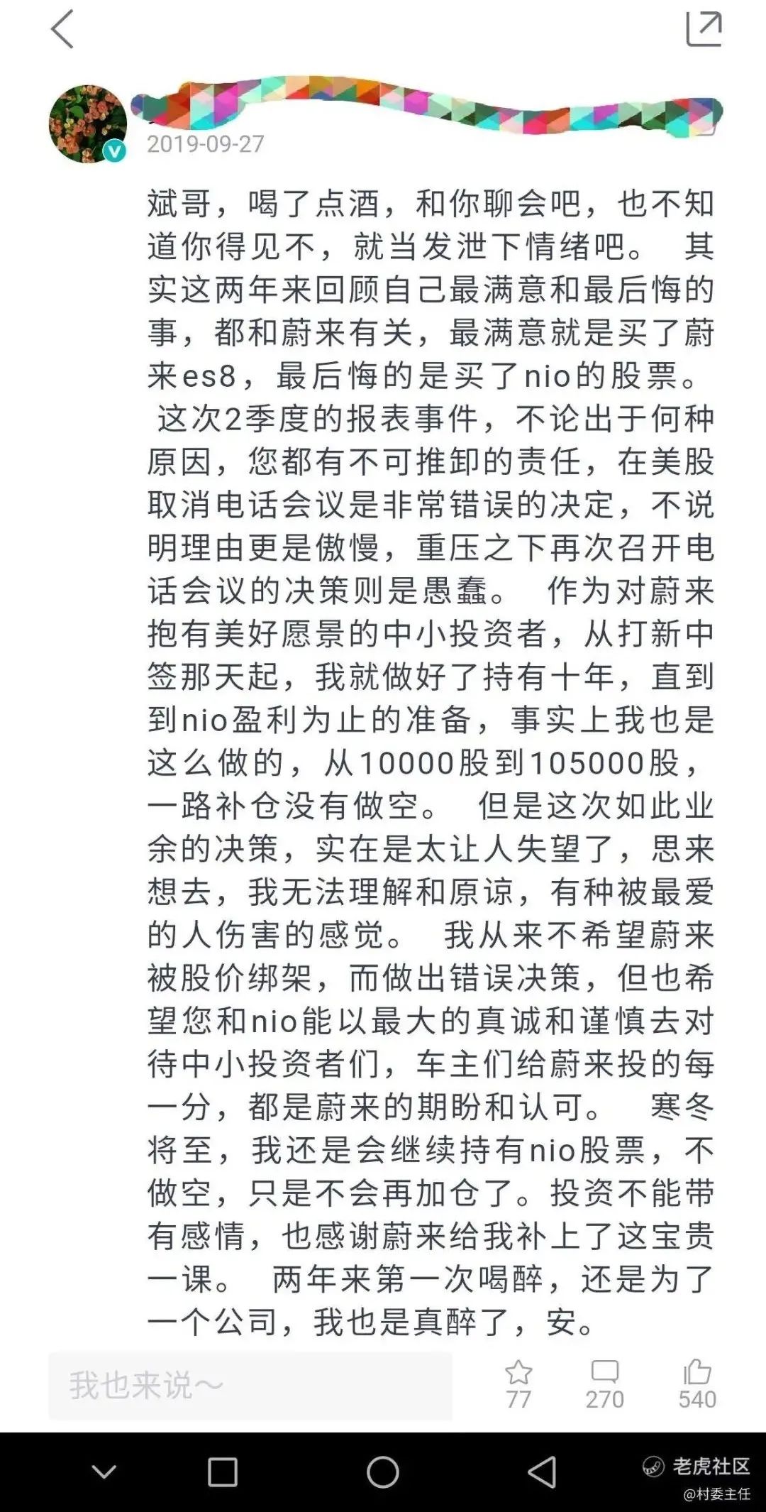 坊间是各种唱衰蔚来的消息,听得多了,村委主任会在老虎证券的社区上试图反驳,更多的时候他会发些自己对蔚来的想法。“我希望朋友们对蔚来再耐心一点,不要因为一点波动就大呼小叫。”帖子里,村委主任不断强调,在那段困难期这几乎变成他的口头禅。
