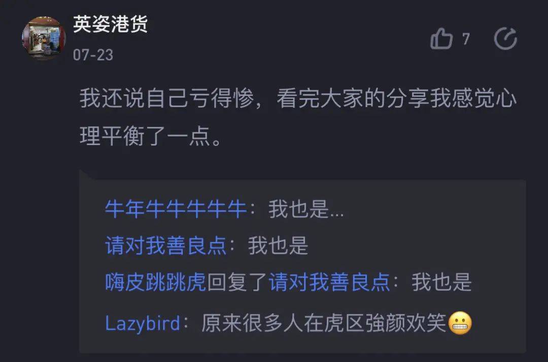 社区的氛围被调动起来了。配合各种夸张的表情包,亏钱这件很气人的事情,竟然在这里呈现出一副滑稽的热闹景象。