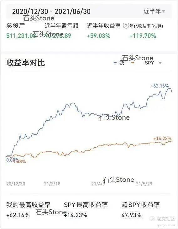 也有人因为盈利独树一帜。昵称“石头Stone”的用户在7月初发了一篇上半年交易复盘的帖子,本来是给自己做个笔记,没想到帖子火了。他的突然走红,是因为他上半年高达62%的收益率。
