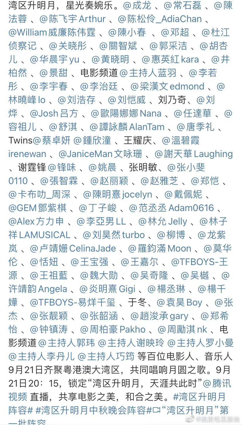 有河南卫视做急先锋,其他卫视还没开播便已经拉开宣传序幕战。19日下午,央视公布了中秋晚会的全部节目单,#湖南卫视中秋火花盛宴#也于当晚登上热搜,陕西卫视甚至台长亲自上阵宣传。但截止到今晚,“最令人期待的中秋之夜”,莫过于大湾区中秋电影音乐晚会:超两百人的嘉宾阵容、久未营业的王菲还将和谢霆锋(主持人)上演世纪同台,真•活久见系列。
