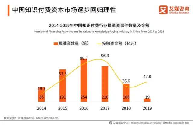 艾媒数据显示,2016年以后,知识付费行业融资数量就开始下滑,2017年后融资金额也出现断崖式下跌,从96.3亿元,跌至36.6亿元。