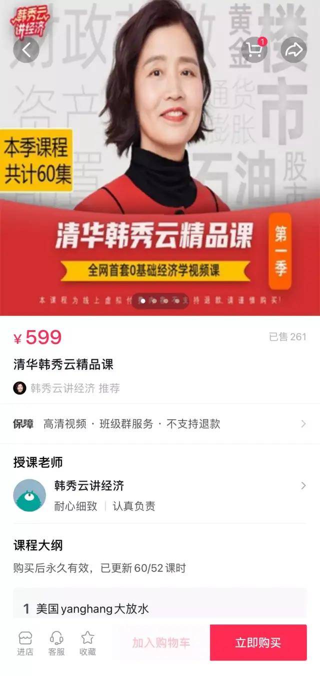 在喜马拉雅上,一套《清华韩秀云讲经济》的音频课程售价是299元,而在抖音和快手上,一套《韩秀云精品课》的视频课程售价为599元。客单价的提高,就导致了消费者的购买意愿下滑。韩秀云付费音频课程的播放量达到了近百万,而视频课程的抖音橱窗销量只有261件。
