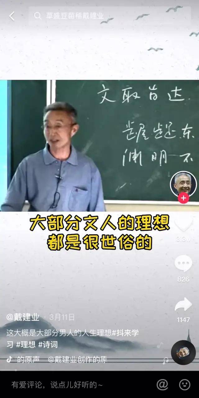 戴建业是第一批接触短视频的教授。从2018年9月,戴建业就入驻了抖音,随后在B站、快手都开了账号。作为华中师范大学的古文教授,戴建业因其幽默诙谐的讲课风格深受观众喜爱。在他的口中,历史不再枯燥,古人也变得有血有肉。