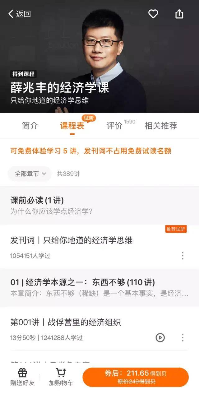 薛兆丰曾是北大的院聘教授,从2017年2月开始,薛兆丰以北京大学国家发展研究院法律经济学教授的身份,在知识付费APP得到上开设专栏《薛兆丰的经济学课》。不到一年的时间,薛兆丰课程的订阅人数就超过25万,营收近5000万。得到的招股书显示,2017年薛兆丰的收益是1615万。