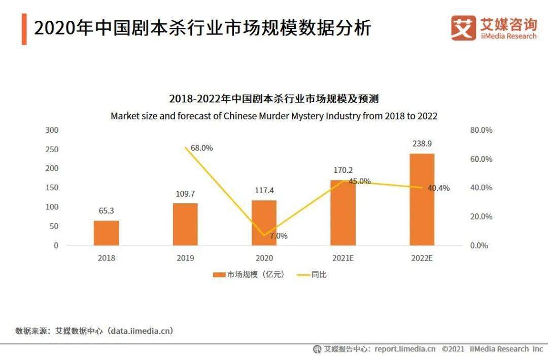 艾媒咨询《2021年中国剧本杀行业发展现状及市场调研分析报告》显示,剧本杀已经成为主流的线下娱乐方式之一,在2021上半年中国消费者偏好线下潮流娱乐方式TOP5中,以36.1%的选择用户占比拿下第三名,同时中国剧本杀行业的市场规模持续壮大,预计到2021年将增至170.2亿元。