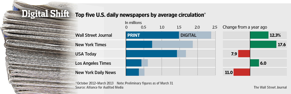 2012到2013年,美国主要报纸的读者总体下降,数字订户增长。图片来源:彭博社