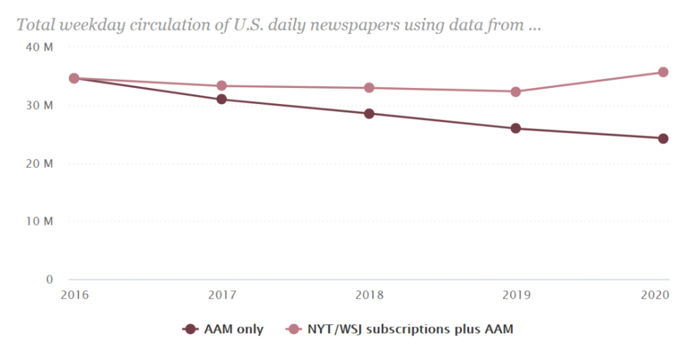 如此一来,核心是为广告商提供参考的流通审核,也被出版商放在了不那么重要的位置上。目前,以《纽约时报》《华盛顿邮报》《华尔街日报》为代表的大型报纸,都不再在AAM公布相关数据。