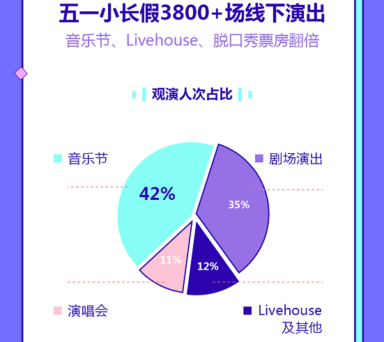 据易观发布的《中国音乐市场年度综合分析2021》报告显示,2021年五一小长假,音乐节迎来爆发阶段,中国线下专业演出超3800场,音乐节占比最高达42%,全国共有56场音乐演出,较2019年同期增加37%,票房收入增加252%,观演人次增加173%。