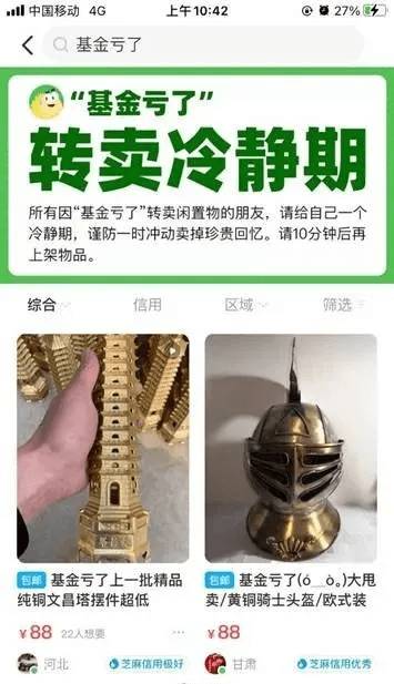 韭菜们亏的欲哭无泪,闲鱼反倒赚了一大波流量。为此,闲鱼专门设置了一个醒目的“基金亏了”转卖冷静期。