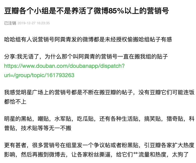 一位曾参与过相关营销的业内人士跟我们算了一笔账:“因为豆瓣发帖成本很低很低,所以大家都乐意在豆瓣营销。找一个人发帖只要几十块,再找些人顶帖,加起来也就一两百,如果帖子内容够好,营销号会主动搬运,运气好的话还能上热搜,像我们平常直接在微博做话题的话,想上热搜成本至少要三万起步,跟微博相比豆瓣性价比太高了。”