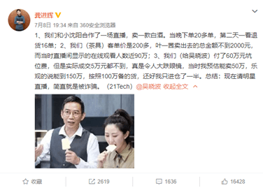 不久后,有媒体报道称,北京某企业负责人和小沈阳合作了一场白酒直播,当晚下单20多单,第二天竟遭退货16单;上海某品牌公司的爆款茶具邀请叶一茜在淘宝直播中推广,在观看人数近90万的情况下,成交额不到2000元;有公司给吴晓波付了60万元坑位费,但实际成交5万元都不到。