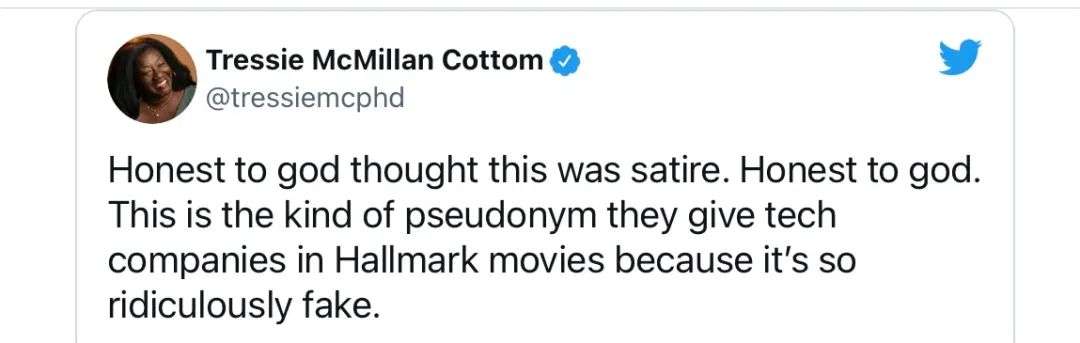 “说实话,我还以为这个名字是在反讽。”一位Twitter用户写道,“我对天发誓,这就是他们在Hallmark电影中会给科技公司起的那种假名字,因为太假了,假得可笑。”