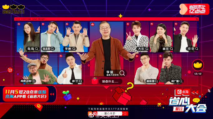 除了脱口秀演员外,”省心大会”还邀请了李响和大左两位淘宝主播讲脱口秀。演员们是从消费者的角度分享自己的购物体验,而李响和大左作为淘宝主播,深度参与双十一,能从不同的角度谈直播带货,也侧面传递了点淘的心智。