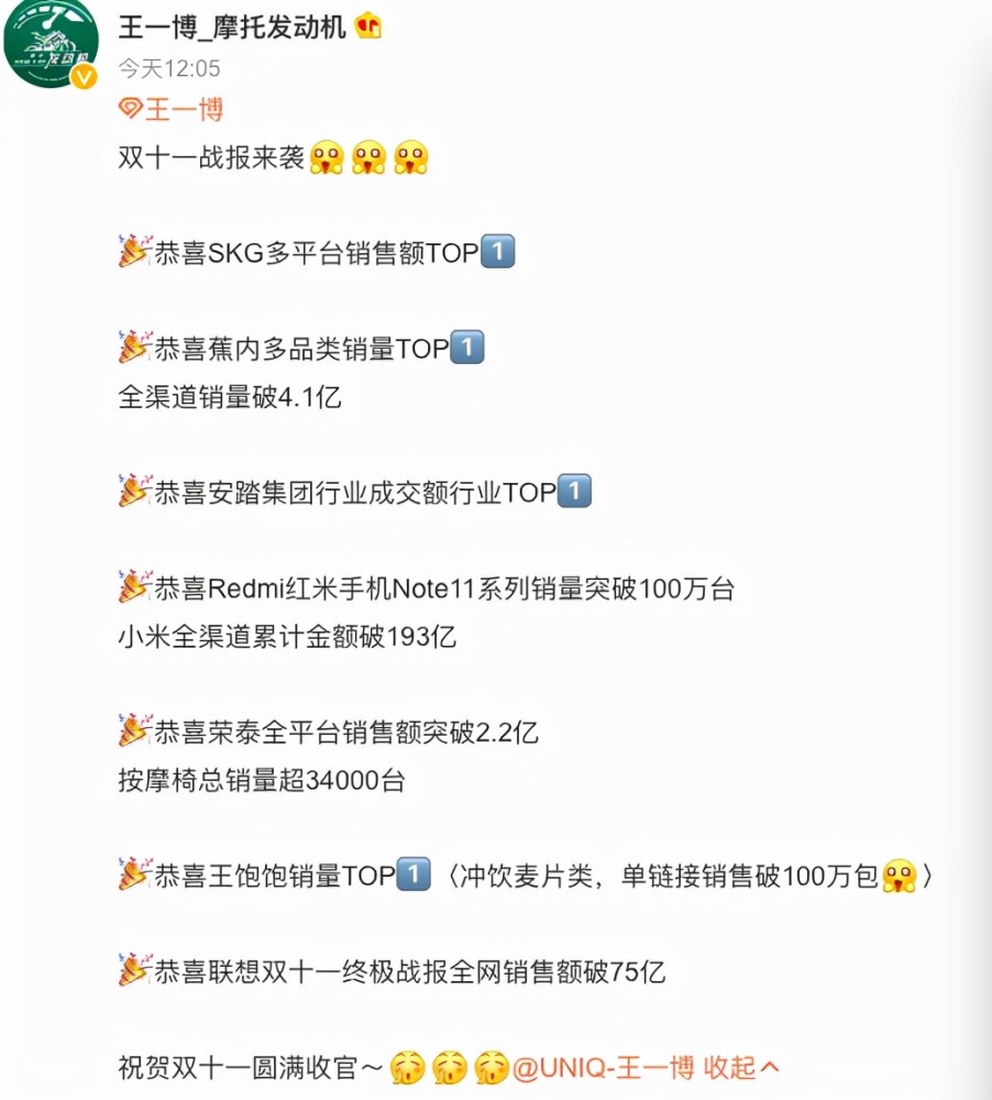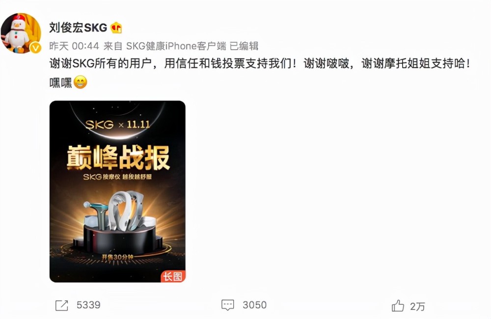 “谢谢啵啵,谢谢摩托姐姐支持哈”,昨晚SKG CEO刘俊宏在发布双11战报时,着重感谢了王一博及其粉丝的贡献。这也是自10月22日官宣王一博为SKG全球代言人之后,他第10次在微博上提及王一博及其粉丝。