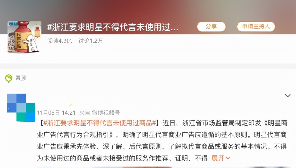 一个巧妙的节点性事件,是11月5日浙江省出台了《明星商业广告代言行为合规指引》,其中细化了明星代言商业广告前需要谨慎选择代言对象、体验使用代言商品、校验广告内容形式和代言后跟踪处置、民事责任承担、主动配合监管监督等应尽法定责任与社会义务。随后,#浙江要求明星不得代言未使用过商品#登上微博话题榜热一,阅读量达到4.3亿。