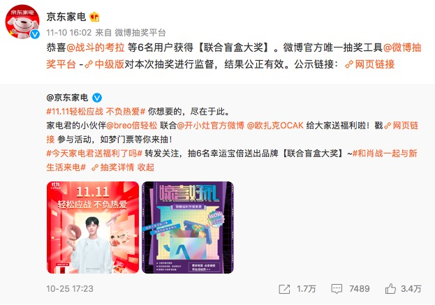 这背后是品牌们愈发熟悉的“促销”操作。在抖音、微博等平台上,不乏肖战粉丝晒出的“波司登开箱”展示,明星同款签名披肩受到了大量喜爱;双11期间京东还联合倍轻松、开小灶、欧扎克、石头等同为肖战代言的品牌,推出了以《如梦之梦》门票等为奖品的多次抽奖活动。事实上,送明信片、代言人立牌、海报、限定周边等都已经是市场的常规操作,而也没有什么比这些更能吸引粉丝的热情。