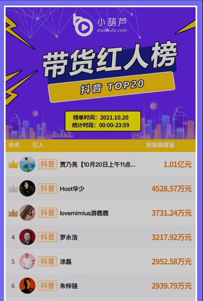 和淘宝上的头部主播抢占话语权不同,抖音上明星直播洗牌频繁,但新秀也在催生。整理过去半个月小葫芦大数据公布的抖音带货红人日榜中,贾乃亮、张柏芝、张婷、辰亦儒、李晨、朱梓骁、戚薇、马可等多位明星,都曾多次跻身TOP20,其中贾乃亮更是以累计超6亿的销售额多次稳居榜首,势头凶猛。