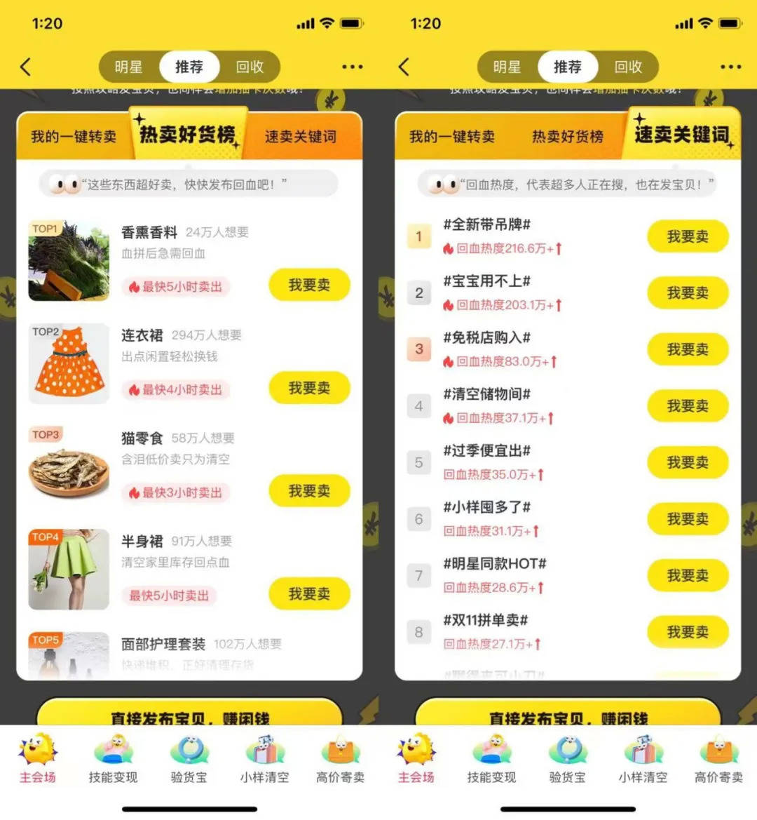 热卖榜单、速卖关键词、一键转卖,闲鱼为剁手党回血操碎了心。不会设置关键词、不知道怎么写宝贝描述?没关系,跟着攻略照猫画虎,宝贝挂上架自然会有买家来询价。验货宝、小法庭等功能的存在,则在保证买卖双方利益的同时,也给了小白们大胆上架出闲置的勇气。
