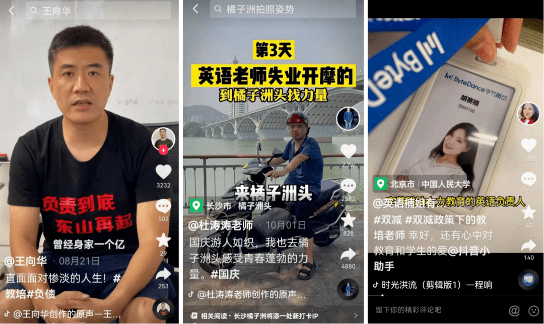 有的教培人在短视频平台上面向学生、家长等群体卖课、售书,有的则成了纯粹的带货主播,还有的是指导教培人转型直播带货……过去三个多月里,从湖南长沙以开摩的作为过渡的英语老师杜涛涛、自称负债7000万的河南于欢英语创始人王向华,到自曝曾为字节跳动大力教育英语负责人的胡赛楠等,都出现在了短视频平台上。