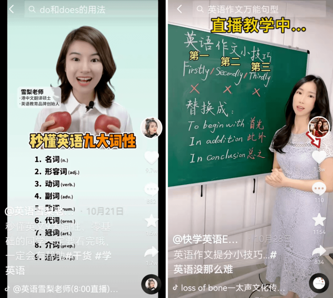 这个圈子的暴富神话并不少。素人博主“英语雪梨老师”侧重零基础英语教学,多位业界人士透露其过去一年多带货过亿,这个成绩也让她成为了转型教培人眼中的“传说”。她和主打新概念英语课程的“快学英语Emily老师”,成为了教培圈的头部大V。