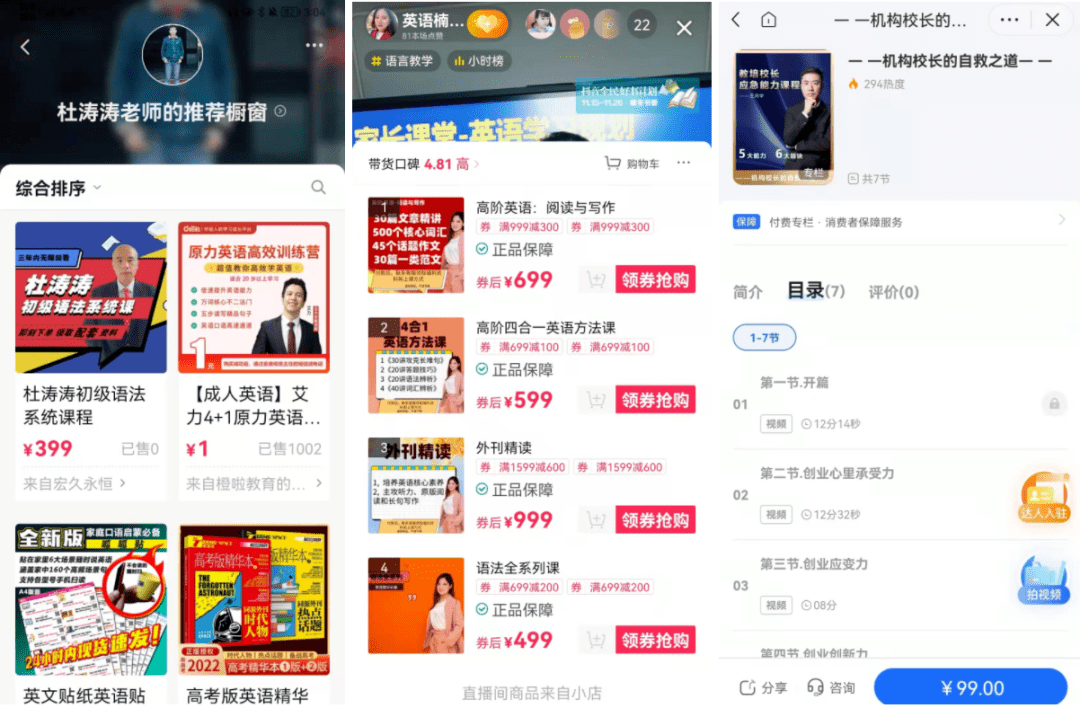 杜涛涛的短视频账号是更新英语相关的内容,拥有三万粉丝的他,短视频平台的橱窗里挂上链接,卖起了图书和课程。胡赛楠选择继续发挥此前十几年教育从业的优势,在短视频平台教起了英语,卖英语学习相关的课程。王向华成了一名知识类教育主播,针对教培校长推出了面对困境的应急能力课程。