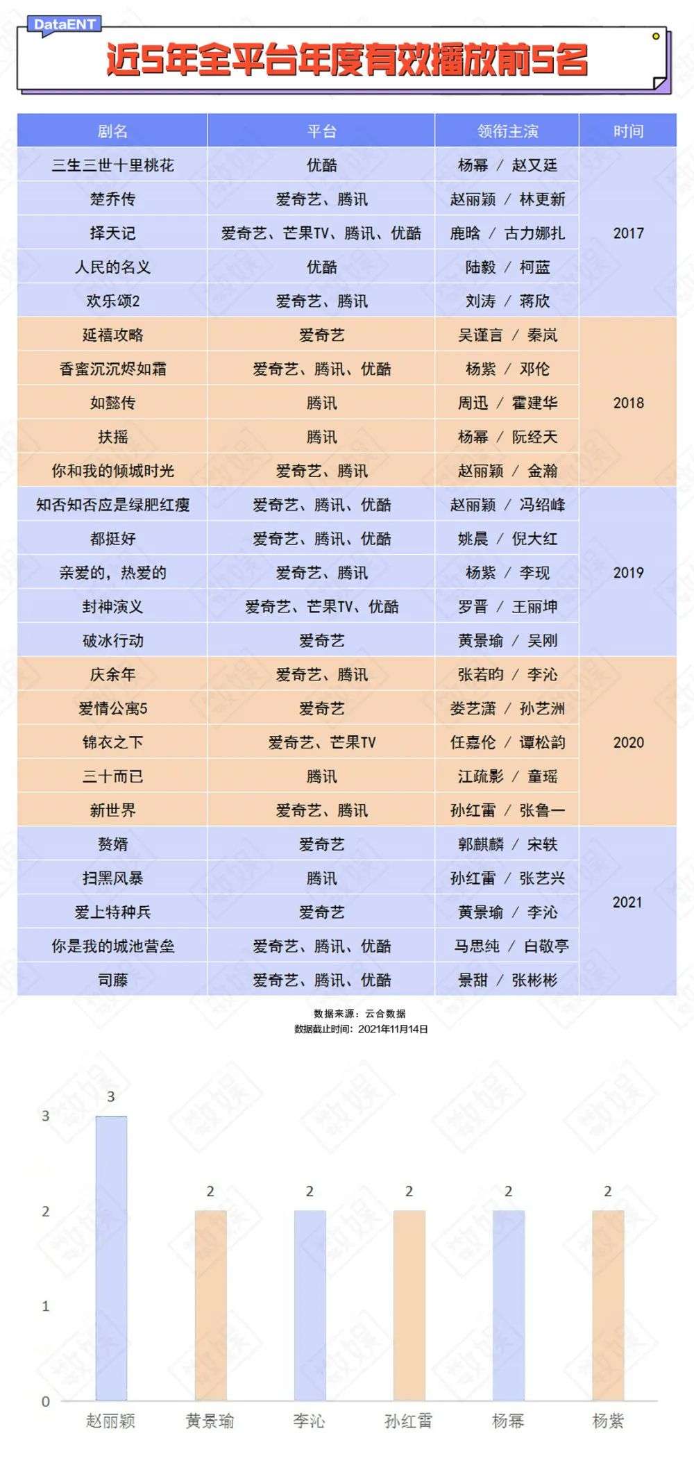 为此,数娱君还参考了云合数据近5年的有效播放数据,结果与电视剧产生了不小的差距。除了赵丽颖两次榜上有名,其他艺人全部大换血,可见收视率也并非是扛剧能力的唯一标准。