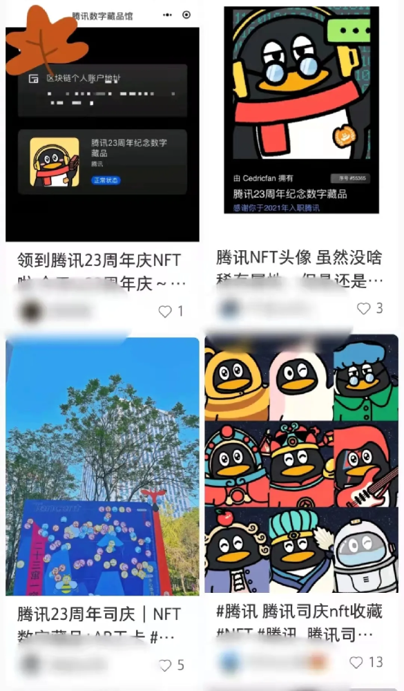 第二天是腾讯公司成立23周年的生日。腾讯向全体员工赠送7.2万份NFT数字藏品,由QQ企鹅形象搭配不同元素组成。有传言称,某些隐藏款在私下交易中卖出了5万元的高价。