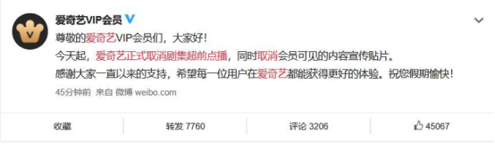 而此前爱优腾的“提前点播”,外界估算虽然增加了一大笔营收,但超前点播、包月会员等付费功能,一直饱受用户诟病。在消改委的点名下,10月4日,爱奇艺宣布正式取消剧集超前点播,同时取消会员可见的内容宣传贴片。随后,腾讯视频和优酷跟进取消该服务。