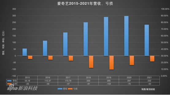 此外,根据爱奇艺最新财报,爱奇艺广告收入下滑,亏损还在进一步加剧。2021年三季度,爱奇艺广告收入为16.6亿元,去年同期为18.4亿元,同比下降9.8%。三季度,爱奇艺营收为人民币76亿元(约合12亿美元),同比增长6%;净亏损17亿元(约合2.684亿美元),而去年同期净亏损为12亿元。