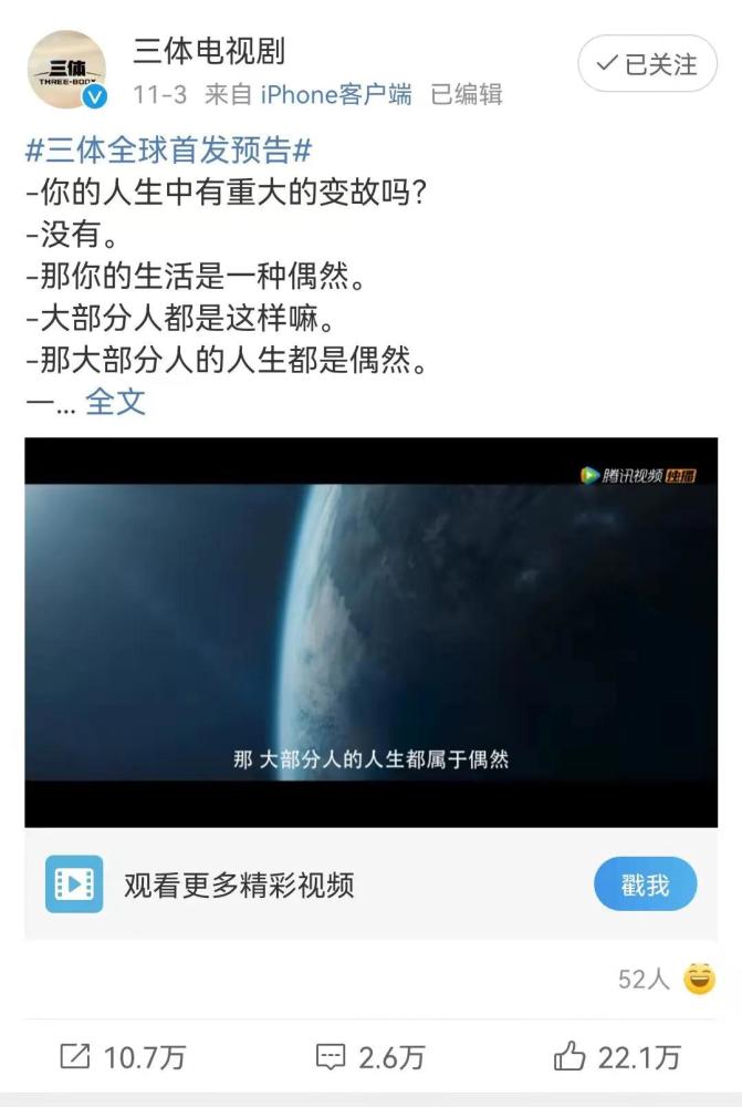 首先从质量上,越来越多的预告片会在2-3分钟内,以密集的信息含量、丰富的视觉层次,让观众获得强烈的心理满足。《三体》作为这一科幻顶流IP的首部真人影视化作品,第一支预告片在发布后立刻冲上热搜,从选角到世界观呈现,都成为观众热议的焦点。