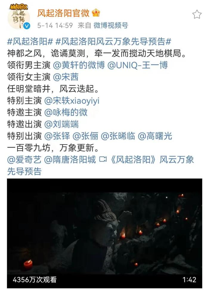 近期热播的《风起洛阳》,则自5月起分别发布了四版预告片。“风云万象”先导预告,展现昌荣盛世下暗藏玄机的故事背景,悬疑感拉满;“洞乾坤”概念预告结合恢弘大气的背景音乐,让我们看到该剧在场景搭建、道具制作上的精致追求;“归藏凤”定档预告,对主角团三人进行逐一介绍;最后一版“入神都”终极预告,从整体角度对城市背景、故事脉络、角色形象等进行全面介绍。