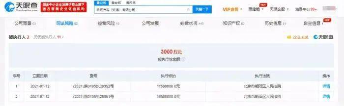 天眼查数据显示,乐视汽车(北京)有限公司因此新增两条被执行人信息,案号分别为(2021)京0105执29351号、(2021)京0105执29352号,执行法院为北京市朝阳区人民法院,执行标的总额为3000万元。