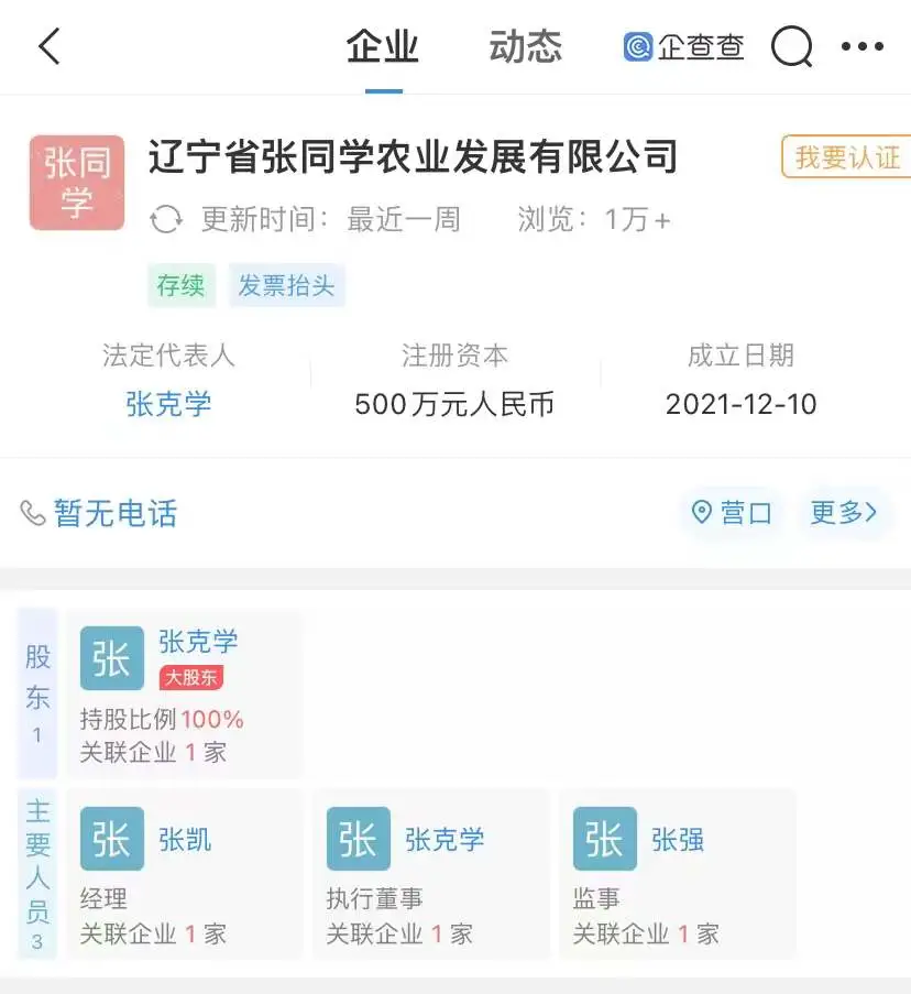 而张同学的农产品带货计划在近期已经有了苗头。根据企查查数据,12月10日,一家名为“辽宁省张同学农业发展有限公司”成立,注册资本500万元,而注册地点正是辽宁省营口市大石桥市建一镇松树村,法定代表人是张克学,张凯是经理,经营范围包含农副产品销售等。