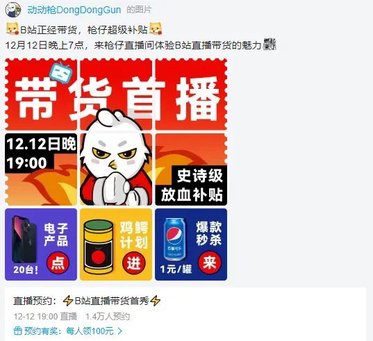 动动枪DongDongGun作为首批内测直播带货的UP主,在官方缺少宣传预热加持的条件下,只能自己专门制作了一期视频预热双十二当天的直播,并将噱头聚焦在“计划赔十万块钱”,精心准备了iPhone、iPad、可乐等引流产品,以此来试图吸引更多的流量。