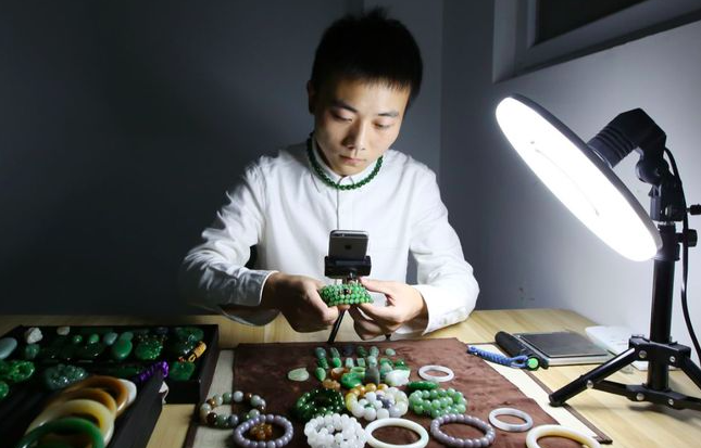“赌石”本是玉石商人和用户在线下的一种玩法,这些翡翠原石或完整或割开一道口子,买家们用手电筒贴着石皮移动,边照边看,见到喜欢的就买下。这些料子(玉石原材料),里面或藏着很多裂和棉(会导致翡翠掉价),或者品相超值,关键就在一个“赌”字。2017年,随着直播带货兴起,赌石直播间也开始爆发。