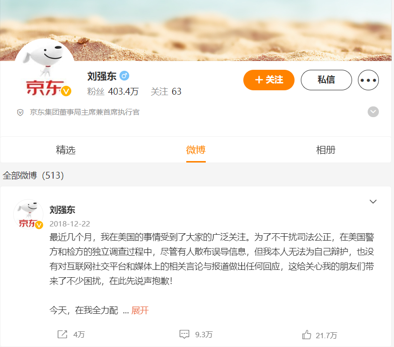 (刘强东微博最后一条动态)