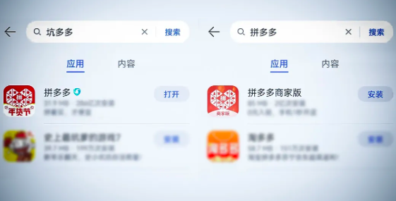 1月7日,有网友反映,在华为应用市场里搜“拼多多”,无法找到普通用户版,只显示商家版,而搜“坑多多”或者“死多多”,却能搜到拼多多APP?