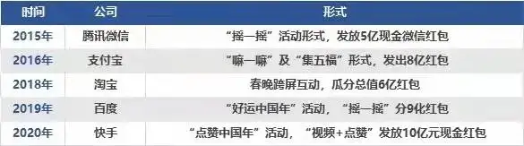 2015年微信红包大获成功,春晚这个流量金矿被重新发现,从此成为互联网巨头的必争之地,阿里、百度、快手、抖音轮番登场,纷纷豪掷数以十亿计的巨资,相继成为春晚合作伙伴。