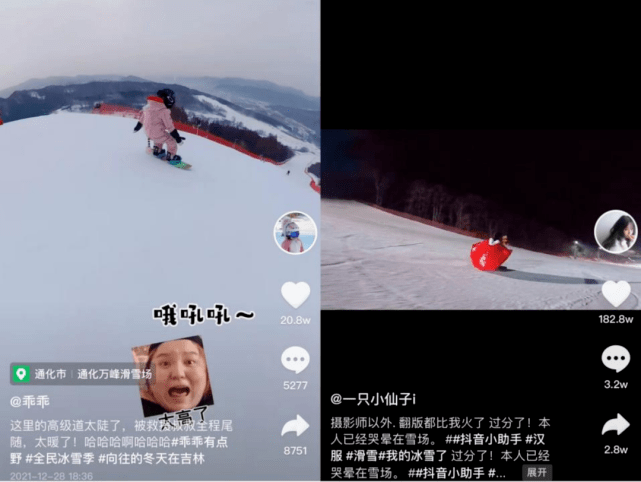 抖音和小红书最先带火的就是“滑雪炫技短视频”。前有4岁萌娃驰骋高级道,后有汉服少女“御雪飞行”,10W+平均视频点赞量让不少网红心动,想要跟上这波流量密码。