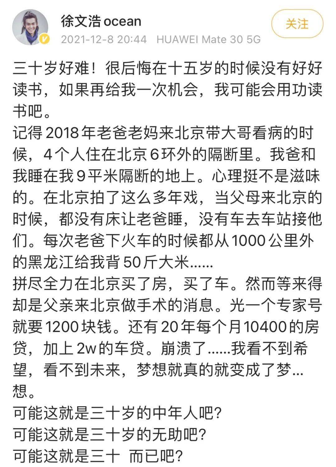 徐文浩看到很多同他一样的人,看起来只有二十四五岁,但实际上已经三十多岁,演了十几年戏,但仍然收入不稳定,买不起房,租房也只能选择六环开外的郊区,或者是燕郊附近。
