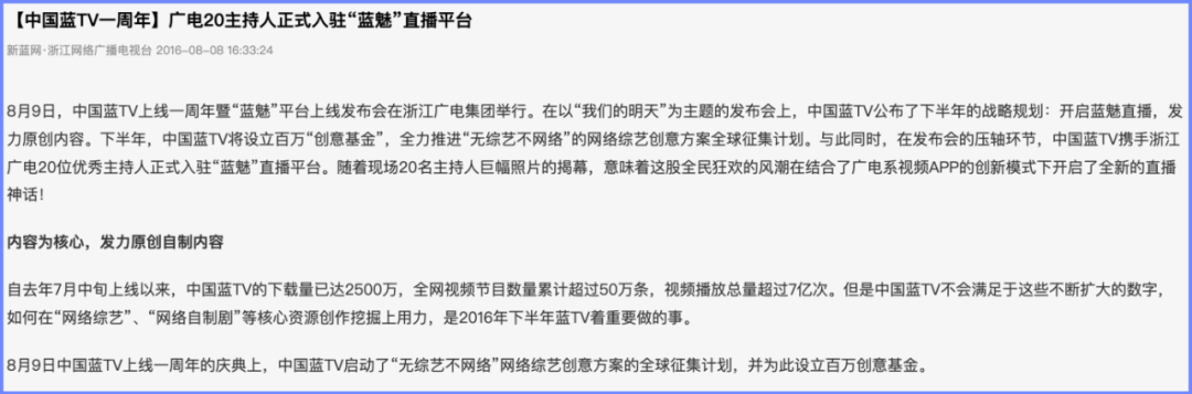 浙江广电也满怀壮志,中国蓝TV客户端上线一周年,下载量就突破了2500万。同时,它还宣布进军直播,推出“蓝魅直播”,并将设立百万“创意基金”,全力推进“无综艺不网络”的网络综艺创意方案全球征集计划。