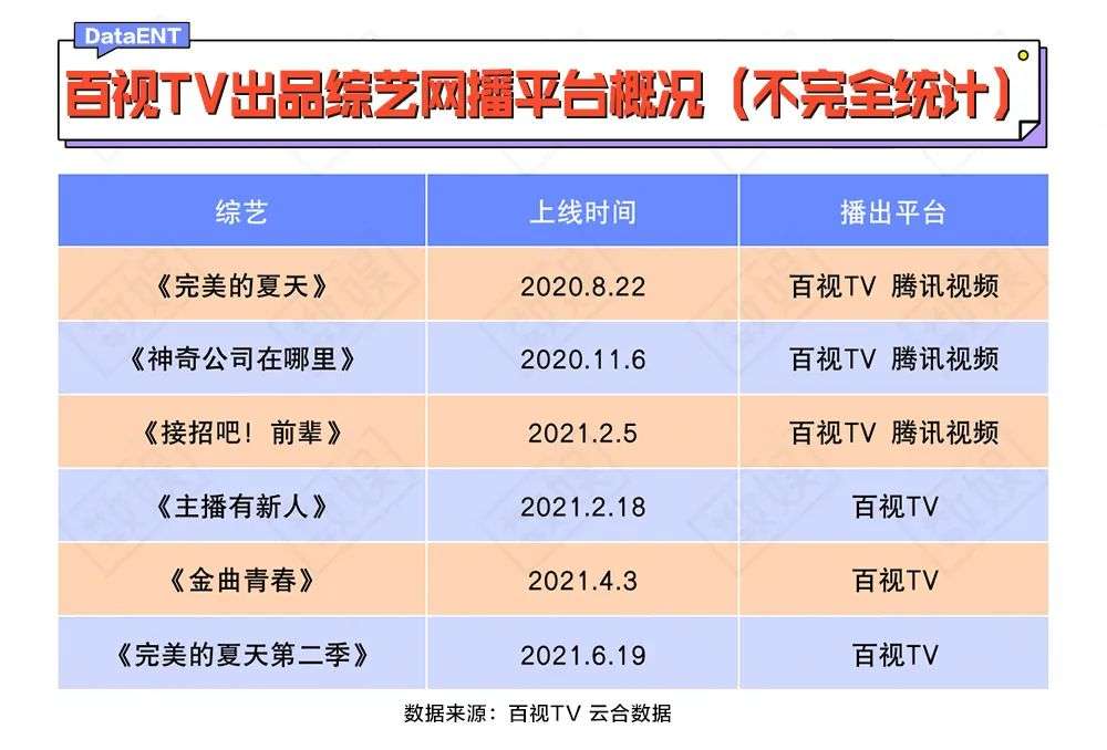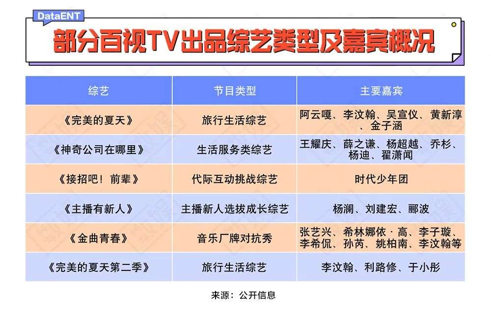 在综艺上,百视TV缺少芒果TV传承广电的制作基因,它与东方卫视联合制作的节目不少都具有很强的粉圈属性。《完美的夏天》邀请的嘉宾多为选秀偶像,《接招吧!前辈》以偶像组合时代少年团为核心展开,《金曲青春》作为舞台竞演综艺,更是被戏称为是“选秀爱豆再就业”。